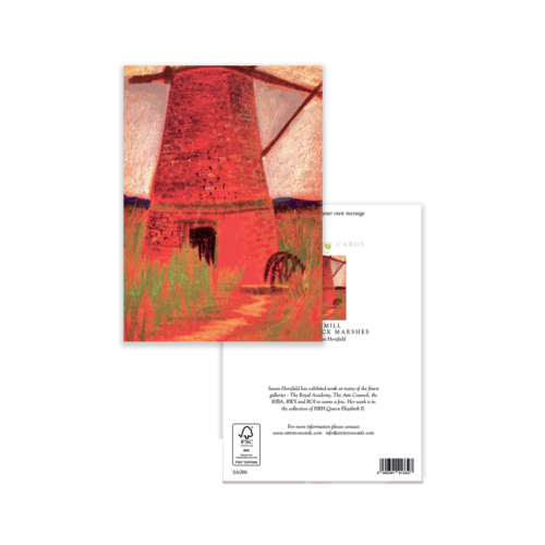 A graphic, high-impact study of Walberswick’s historic windmill by Susan Horsfield. The artist’s layered pastel/gouache marks and burnished reds give this coastal landmark real shelf presence. Sits neatly with coastal, architecture and East Anglia edits.