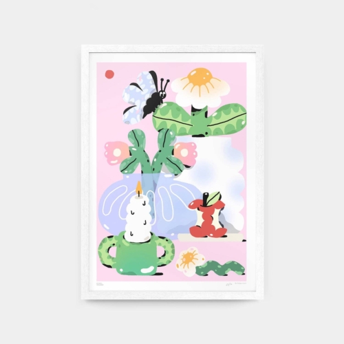 The Small Things by Poppy Crew This illustration featuring summer flowers in translucent, bubbly vases was created by Poppy Crew as part of her latest series, exploring how the small joys of summer kept her going through a winter spent in lockdown. “For such a long time the only thing we could actually do was to go outside and be around nature to get some sort of escape, which I think helped me start to notice and appreciate the smaller things, more than I maybe did before. This new appreciation of the smaller things made me want to create my prints around this too, things that bring joy like flowers, fresh fruit, being around bugs and nature.