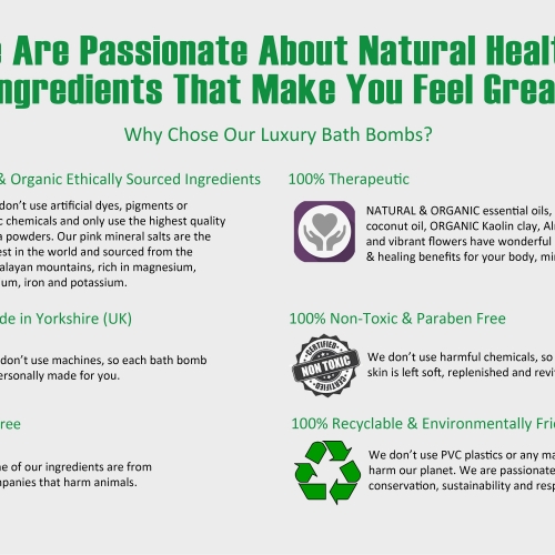 We only use the finest natural/organic ethically sourced ingredients which are toxin free, palm oil free, phthalate free, paraben free, cruelty free and all are packaging is fully recyclable and bio-degradable.