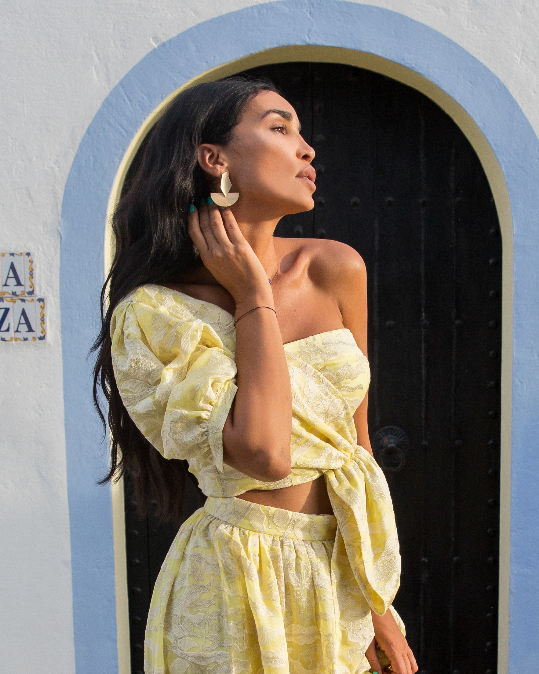 Thomasina – street couture meets resort . The Thomasina bodice top is boned at the sides for that figure hugging fit and perfect positioning across the bust area. With its one shoulder sash detail and its lurex embroidered luxury jacquard, this style is quintessential Isla Bonita. Concealed side zip fastening.