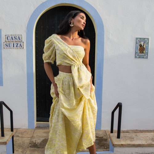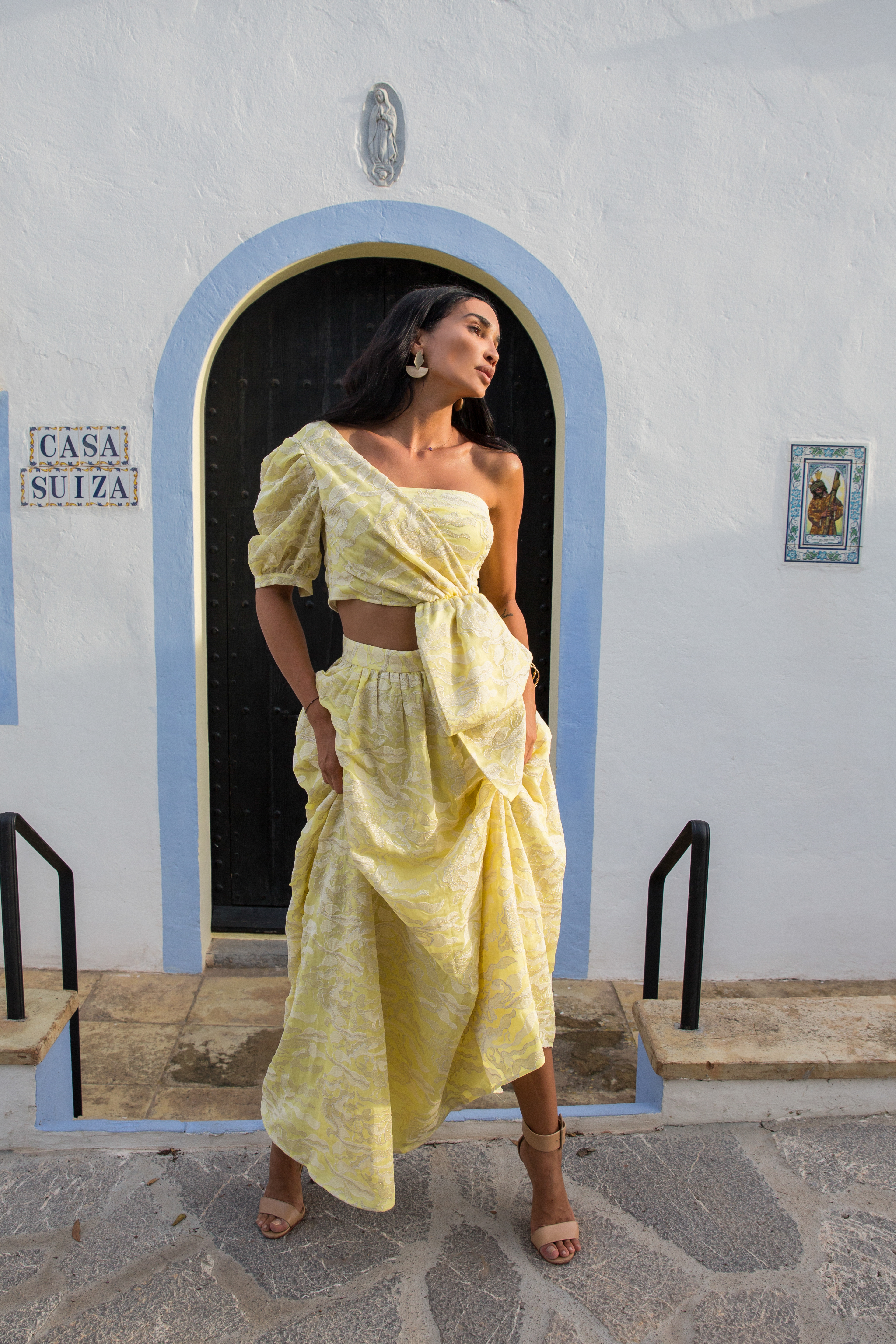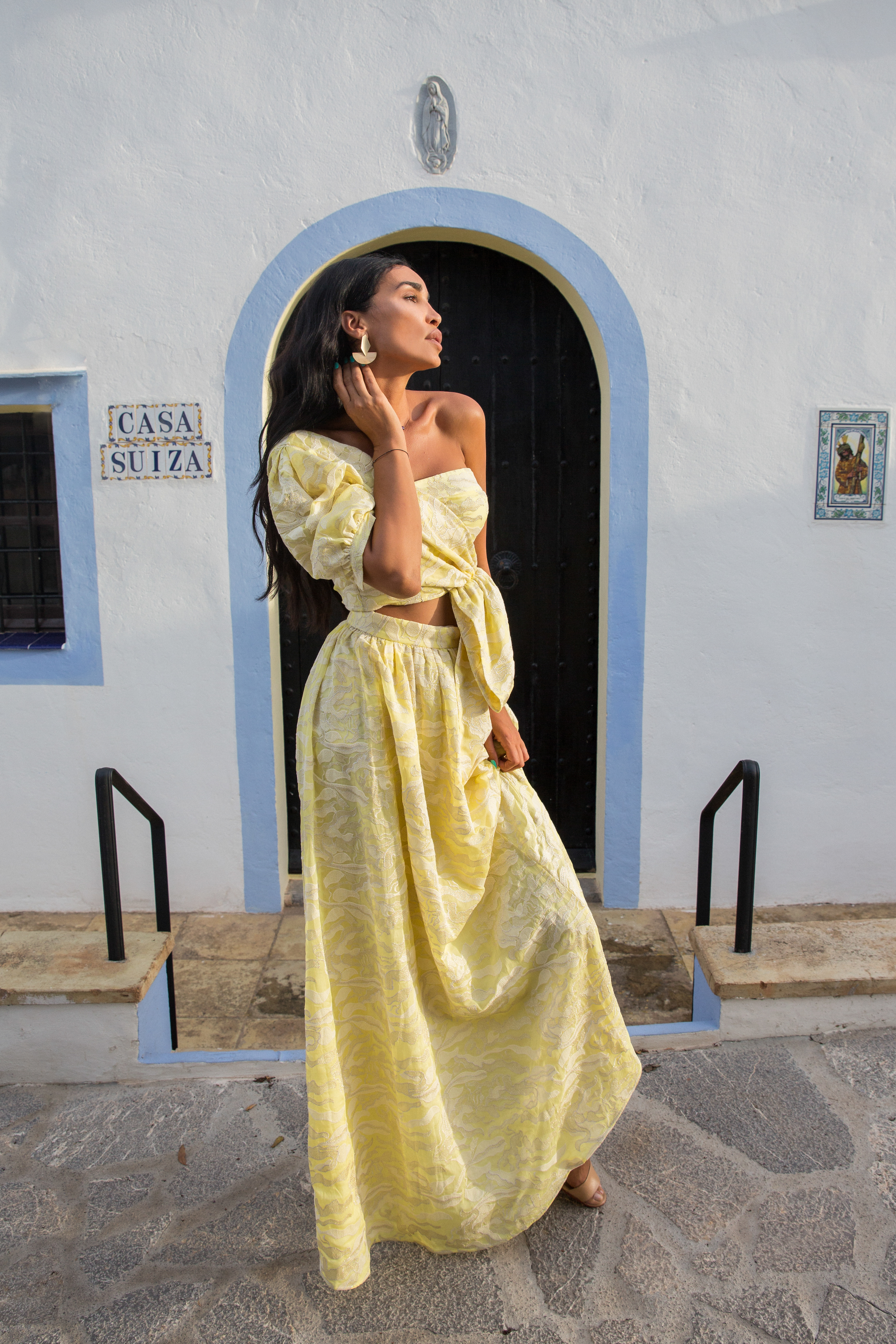 The Thomasina maxi skirt has a beautiful dip back hem to make ease when moving around and to add that extra glamour to a simple but effective style. With side concealed zip fastening with hook and eye. Perfect for those sunset evenings or special occasions.