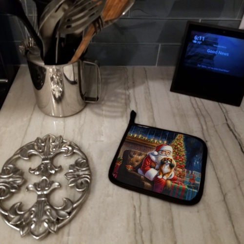 Pair of Pot Holders featuring breed specific Tibetan Spaniel artwork. Celebrate Christmas with this Christmas Pair of Pot Holders. A Pair of Pot Holders to match your kitchen decor. Made in the USA these are thick and functional. Full color artwork decorates the front polyester fabric of the hot pad and accented by a black trim. Use these at as a trivet for your Thanksgiving or Christmas tablescape. Filled with insulated fabric and quilted for durability. These colorful pot holders will make a great gift for your favorite home cook or executive chef. Each pot holder measures approximately 7 1/2 inches by 7 1/2 inches. A hanging tab is included.