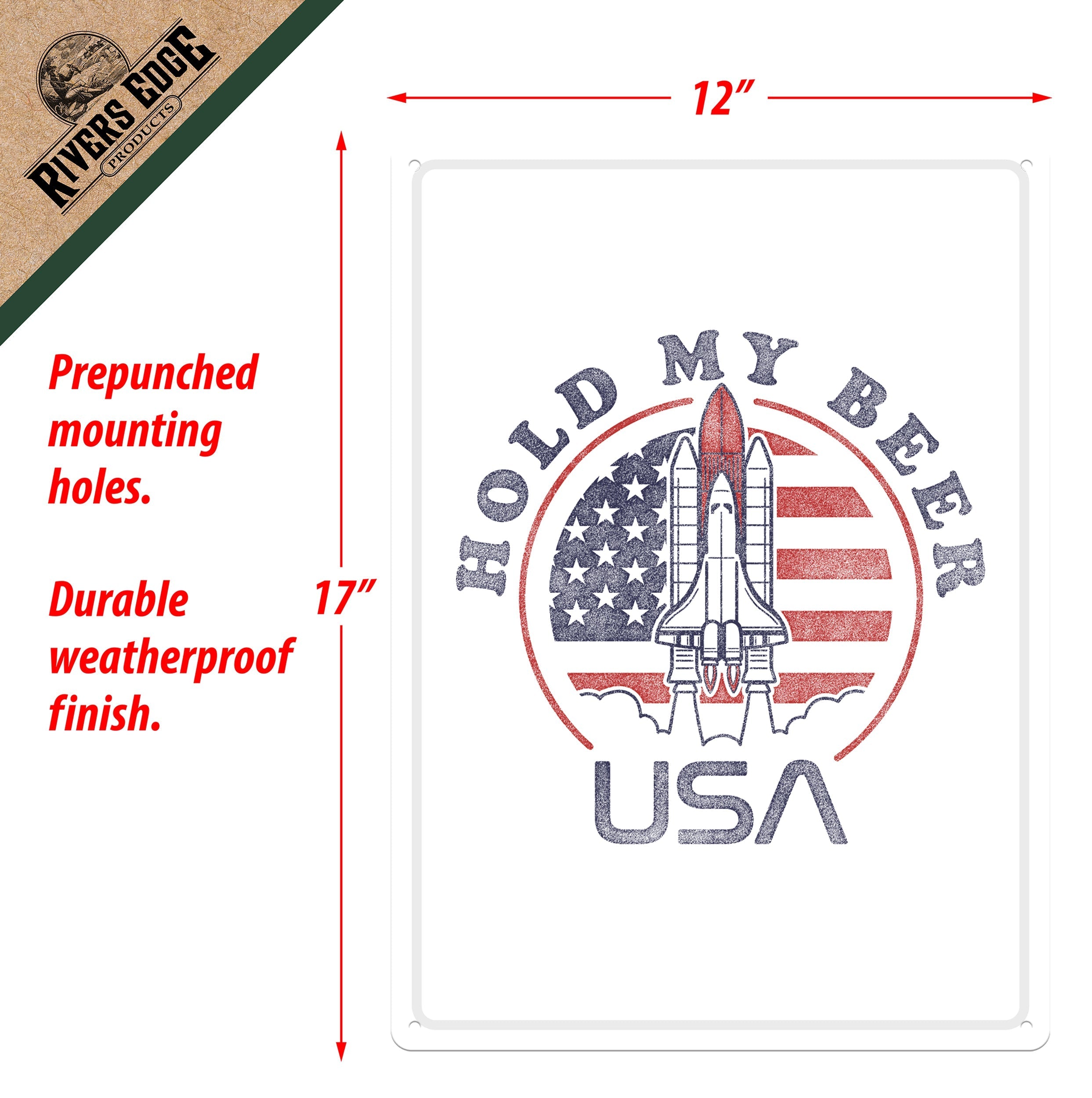This metal tin sign from Rivers Edge Products is ideal wall decor for outdoor enthusiasts with a sense of humor. Customize your garage, home bar, or living space with this funny tin sign.Features:Dimension measures 17 inches by 12 inches widePre-punched corner holesWeatherproof finish