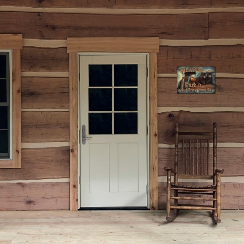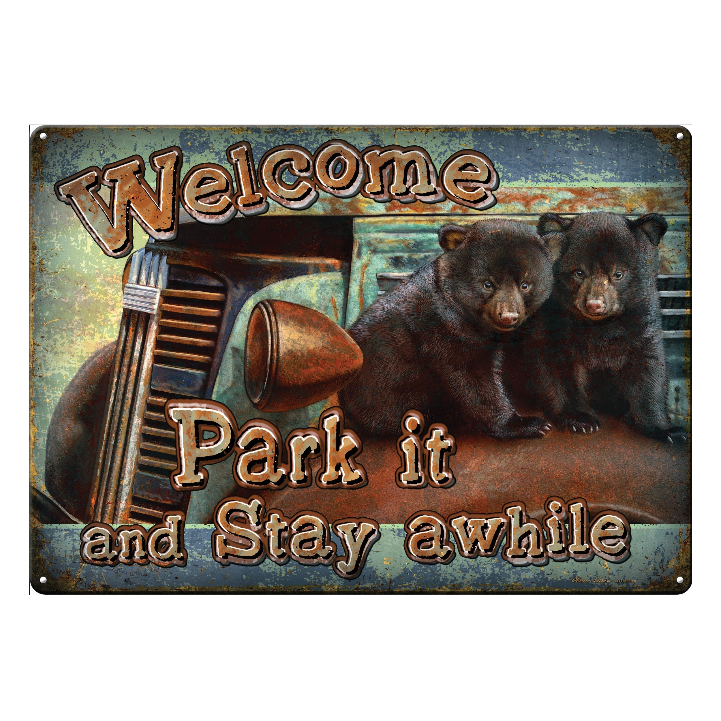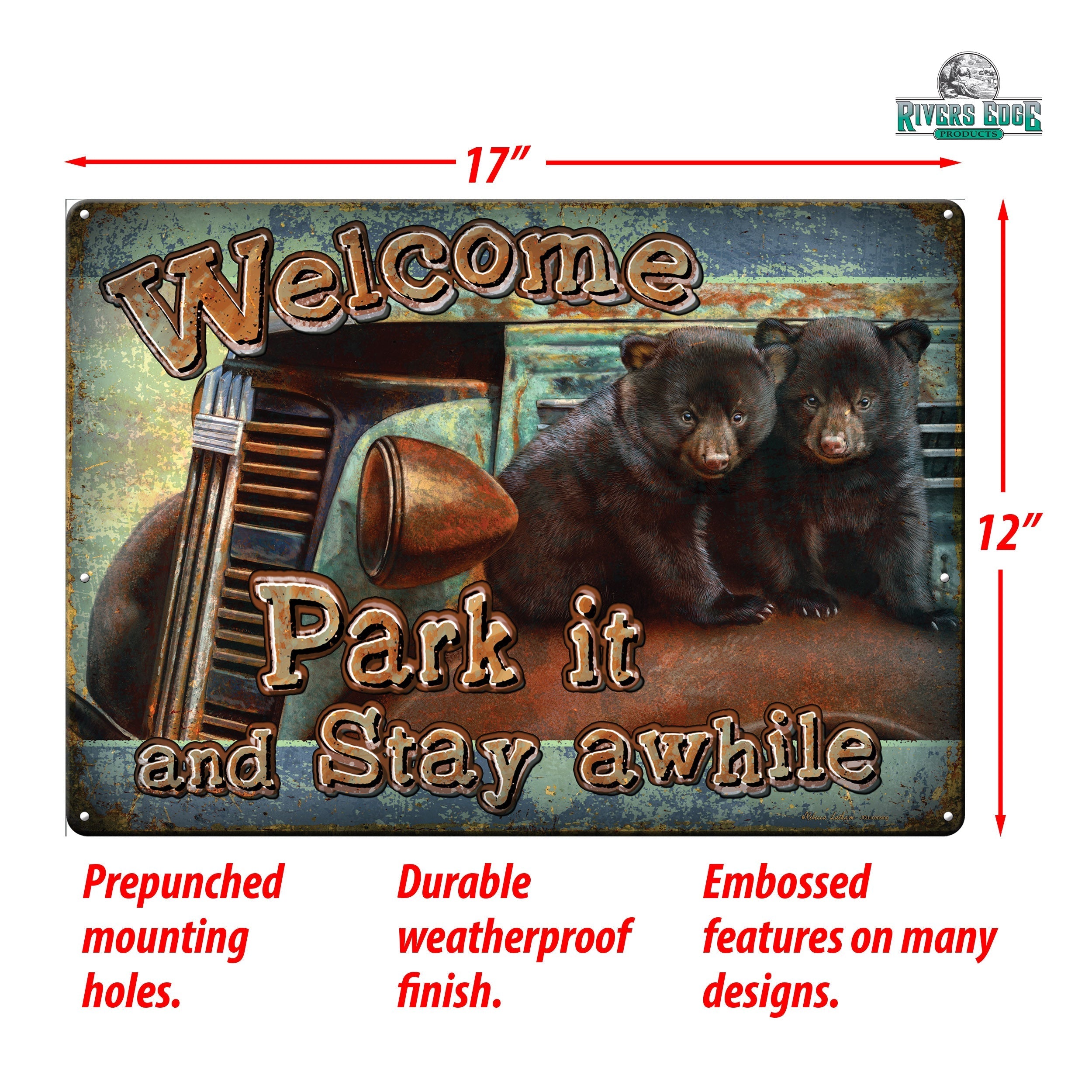 Welcome them and ask them to stay with this fun design. This metal tin sign from Rivers Edge Products is ideal wall decor for outdoor enthusiasts with a sense of humor. Customize your garage, home bar, or living space with this funny tin sign.Features:Dimension measures 17 inches by 12 inches widePre-punched corner holesWeatherproof finish