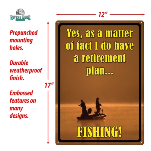 When it’s retirement time, it’s fishing time! This metal tin sign from Rivers Edge Products is ideal wall decor for outdoor enthusiasts with a sense of humor. Customize your garage, home bar, or living space with this funny tin sign.Features:Dimension measures 17 inches by 12 inches widePre-punched corner holesWeatherproof finish