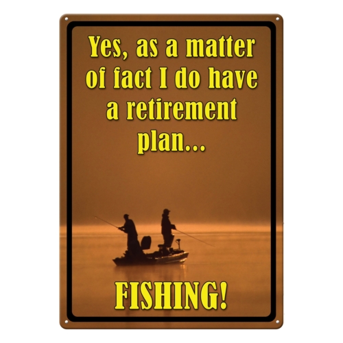 When it’s retirement time, it’s fishing time! This metal tin sign from Rivers Edge Products is ideal wall decor for outdoor enthusiasts with a sense of humor. Customize your garage, home bar, or living space with this funny tin sign.Features:Dimension measures 17 inches by 12 inches widePre-punched corner holesWeatherproof finish