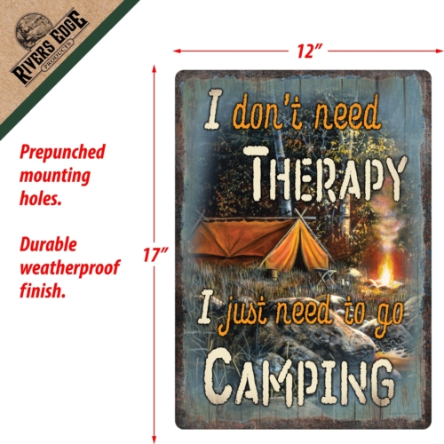 If you go camping, it will solve a lot of life’s problems. This metal tin sign from Rivers Edge Products is ideal wall decor for outdoor enthusiasts. Customize your garage, home bar, or living space with this tin sign.Features: 17 inches by 12 inches wide Pre-punched corner holes for easy wall mounting Durable weatherproof finish