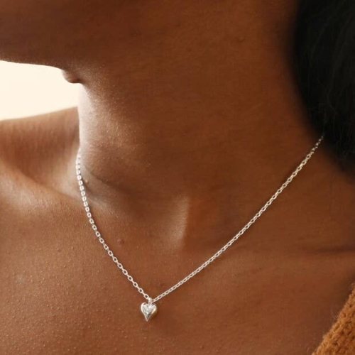 A rounded heart-shaped pendant with a super shiny finish is suspended on a delicate trace chain. Dimensionschain length – 40.5cm (16″) with a 5cm extender chainpendant – width 7mm x height 10mm x depth 5mmMade fromsterling silver plated brass