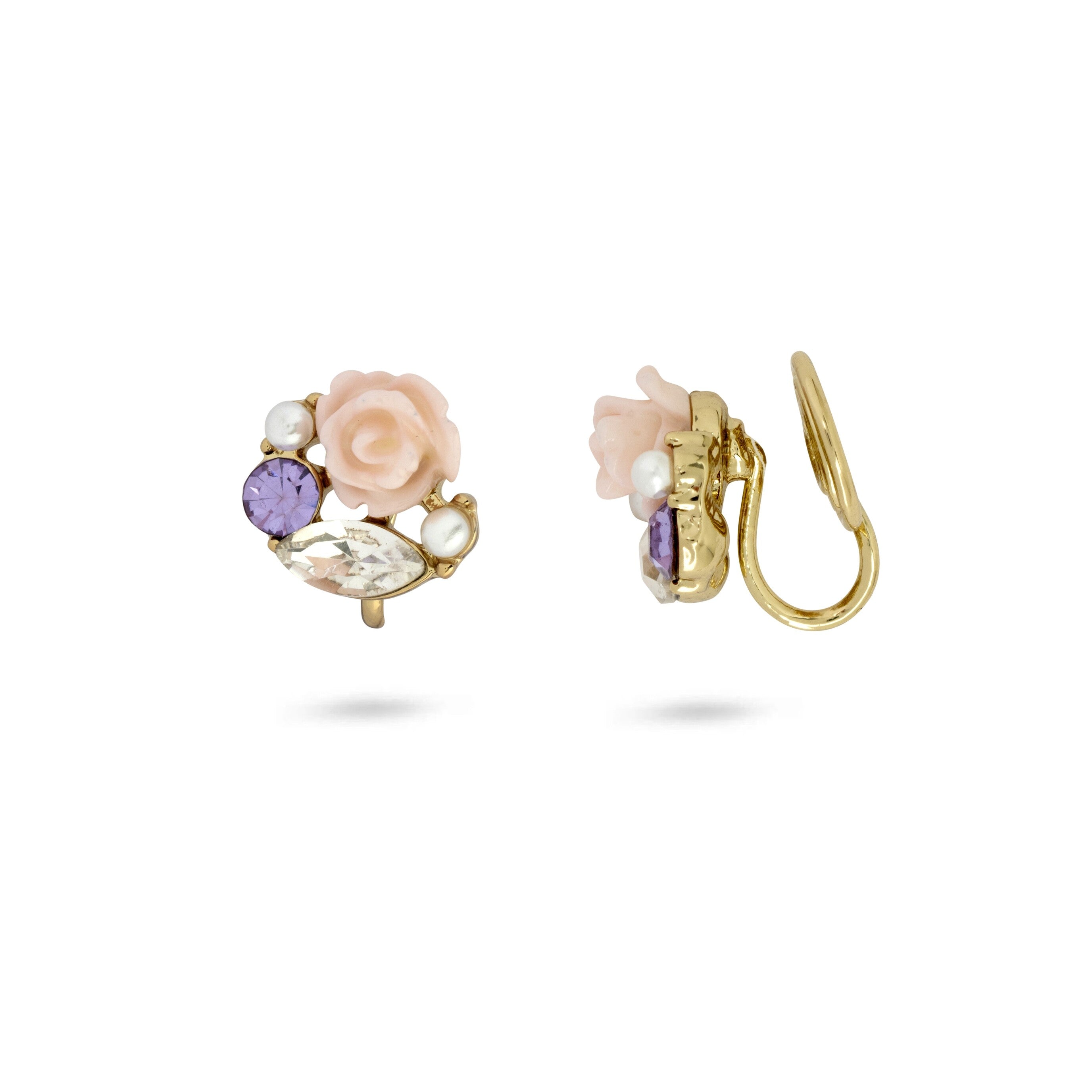 DESCRIPTIONAdd a bit of summer sparkle to your look with these pretty clip-on earrings Featuring a tiny pink rose surrounded by white and purple crystals flanked by two faux pearls. No piercing? No problem! These earrings simply slip under your lobe and the optional silicone backs supplied mean they grip to your ear and stay put all day without you feeling a thing. SIZINGWidth at widest point 10mm, full length of earring 10mm. GOOD TO KNOWOur new clip-on earring range is affordable and lightweight and is crafted from alloy metals, a brass base with either silver or gold plating. Each earring comes with a removable silicone cover for the back, providing extra grip and comfort. PACKAGINGDelivered in a Gold Trip presentation box, perfect for gifting yourself or others.