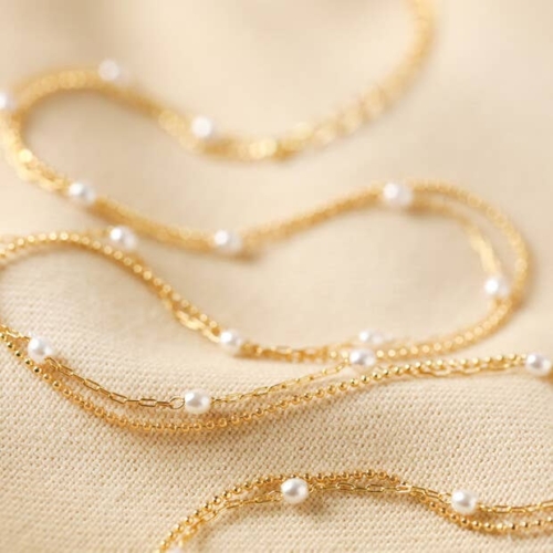 Featuring a dainty gold ball chain suspended alongside a trace chain peppered with tiny faux seed pearls, this necklace is the ideal addition to anyone’s everyday wardrobe. Fastening simply via a lobster clasp and extender chain, this sweet little necklace can be worn at a variety of lengths.Dimensionsnecklace length – 40.5cm (16″) with a 5cm extender chainMade from14ct gold plated brass, glass pearls