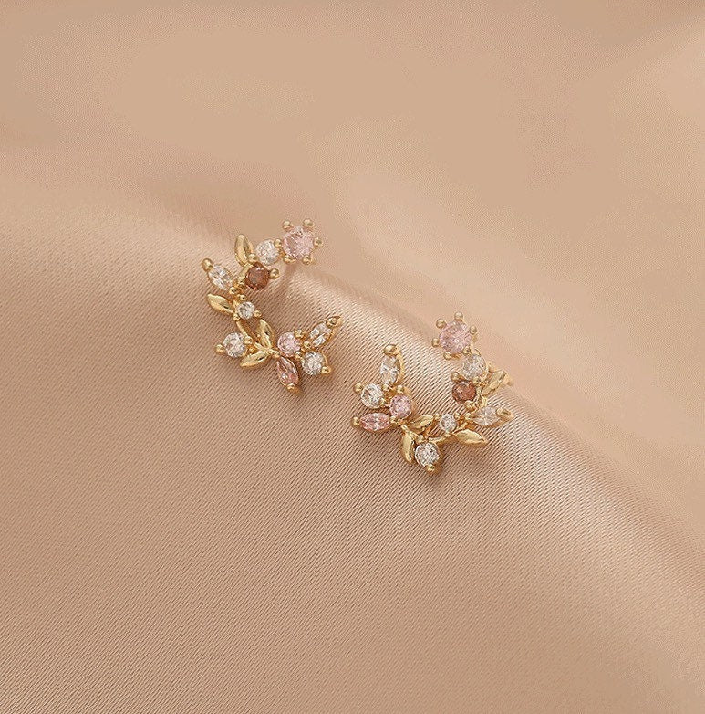 These intricate earrings feature a tiny wreath design, Sterling silver construction, with flower and leaf accents and a dainty aesthetic, completed by a 14K yellow gold plated finish. Size: 1.8cm