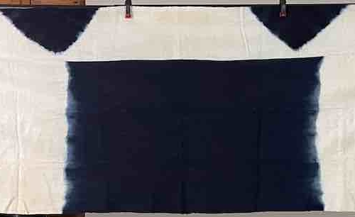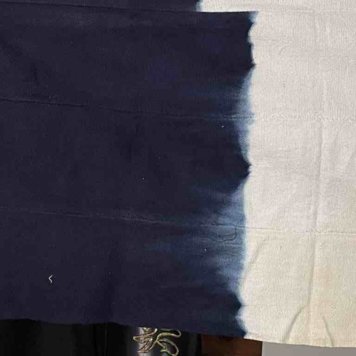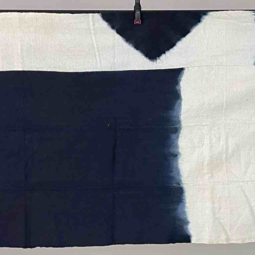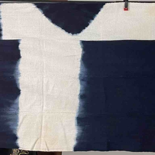 This textile is woven and dyed in Nigeria, by the Tiv people. Woven out of cotton and died from indigo dyes. Textiles of this configuration, of this shape, i.e., long and narrow (3 or 4 bands only), are used by Tiv women as “head ties”: they wrap their hairdo in these as a very elegant accessory. Head ties of this nature would normally be made to match whatever wraparound skirt they would wear with it. We find that these are especially useful in cultures outside of Africa as scarves, shawls or table runners. This is a traditionally woven and dyed textile but is not one that has been used already, not vintage; we cannot guarantee that this textile will not run if washed. We recommend dry cleaning methods to avoid running very carefully hand washing. This textile measures 68 x 21″ (173 x 53 cm)