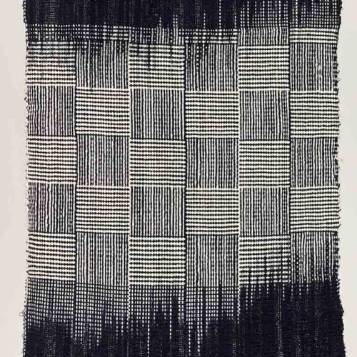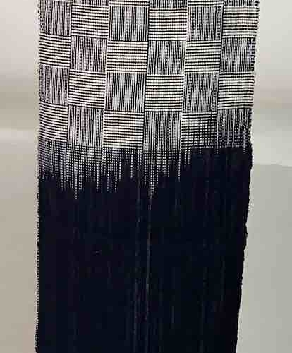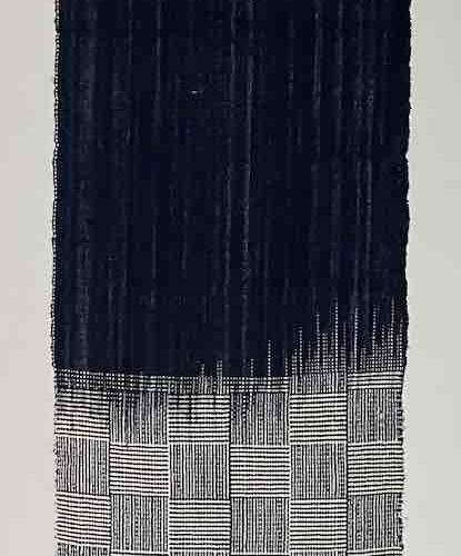 This textile is woven and dyed in Nigeria, by the Tiv people. Woven out of cotton and died from indigo dyes. Textiles of this configuration, of this shape, i.e., long and narrow (3 or 4 bands only), are used by Tiv women as “head ties”: they wrap their hairdo in these as a very elegant accessory. Head ties of this nature would normally be made to match whatever wraparound skirt they would wear with it. This weave is unusually wide so we have adapted single band for our use. This design is reminiscent of a tortoise shell so is called the “tortoise” design. We find that these are especially useful in cultures outside of Africa as scarves, shawls or table runners. This is a traditionally woven and dyed textile but is not one that has been used already, not vintage; we cannot guarantee that this textile will not run if washed. We recommend dry cleaning methods to avoid running very carefully hand washing. This textile measures 70 x 11″ (178 x 28 cm)