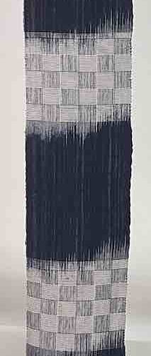 This textile is woven and dyed in Nigeria, by the Tiv people. Woven out of cotton and died from indigo dyes. Textiles of this configuration, of this shape, i.e., long and narrow (3 or 4 bands only), are used by Tiv women as “head ties”: they wrap their hairdo in these as a very elegant accessory. Head ties of this nature would normally be made to match whatever wraparound skirt they would wear with it. This weave is unusually wide so we have adapted single band for our use. This design is reminiscent of a tortoise shell so is called the “tortoise” design. We find that these are especially useful in cultures outside of Africa as scarves, shawls or table runners. This is a traditionally woven and dyed textile but is not one that has been used already, not vintage; we cannot guarantee that this textile will not run if washed. We recommend dry cleaning methods to avoid running very carefully hand washing. This textile measures 70 x 11″ (178 x 28 cm)
