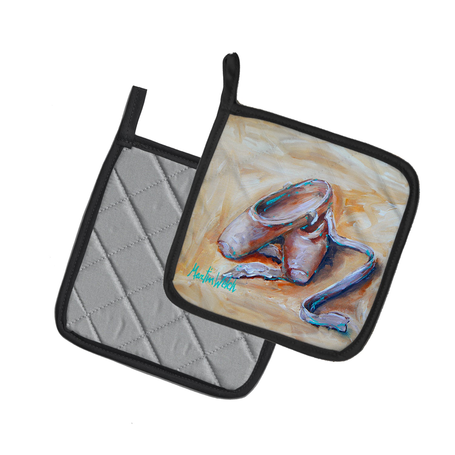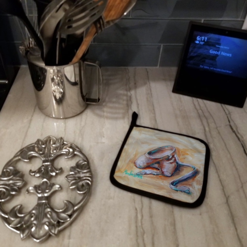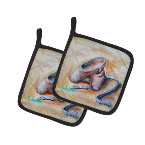 A Pair of Pot Holders to match your kitchen decor. Made in the USA these are thick and functional. Full color artwork decorates the front polyester fabric of the hot pad and accented by a black trim. Use these at as a trivet for your Thanksgiving or Christmas tablescape. Filled with insulated fabric and quilted for durability. These colorful pot holders will make a great gift for your favorite home cook or executive chef. Each pot holder measures approximately 7 1/2 inches by 7 1/2 inches. A hanging tab is included.