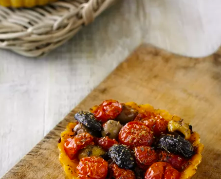 Simply tasty vegetable tart filled with cherry tomato, olives and fresh herbs to give you a unique experience of Mediterranean flavours.