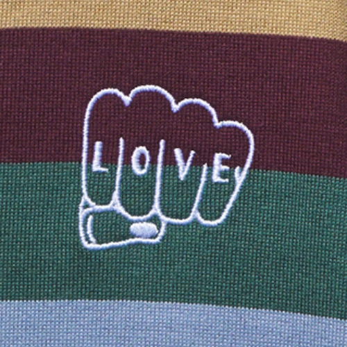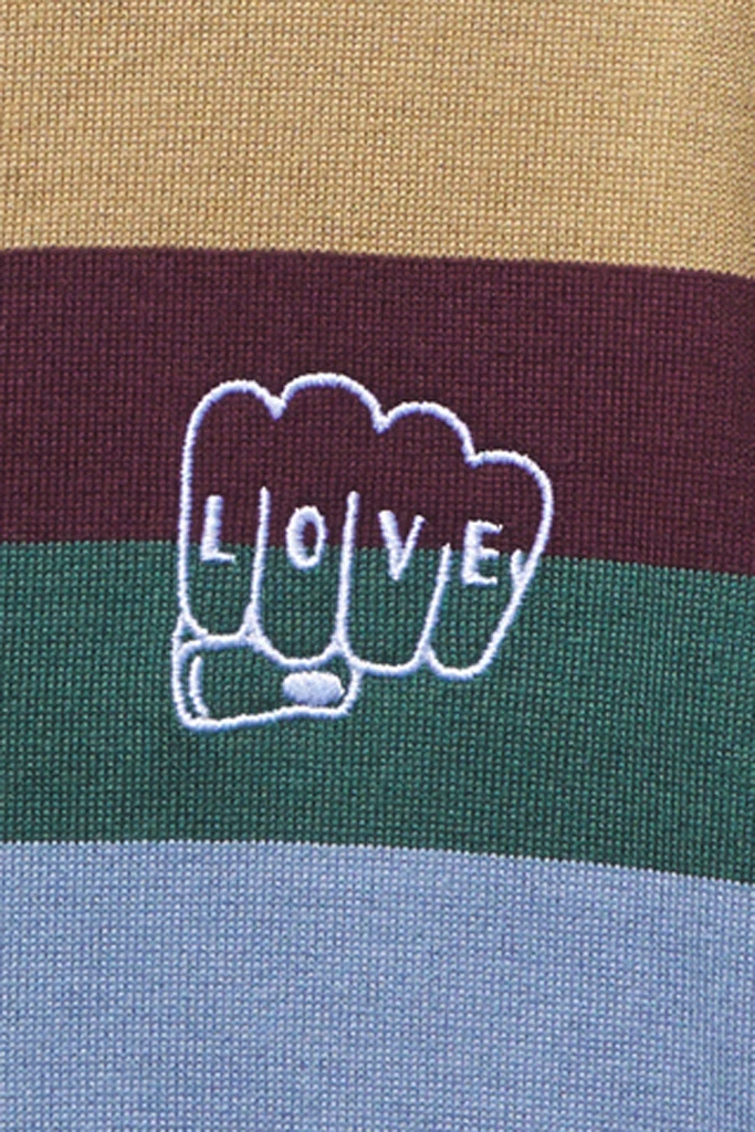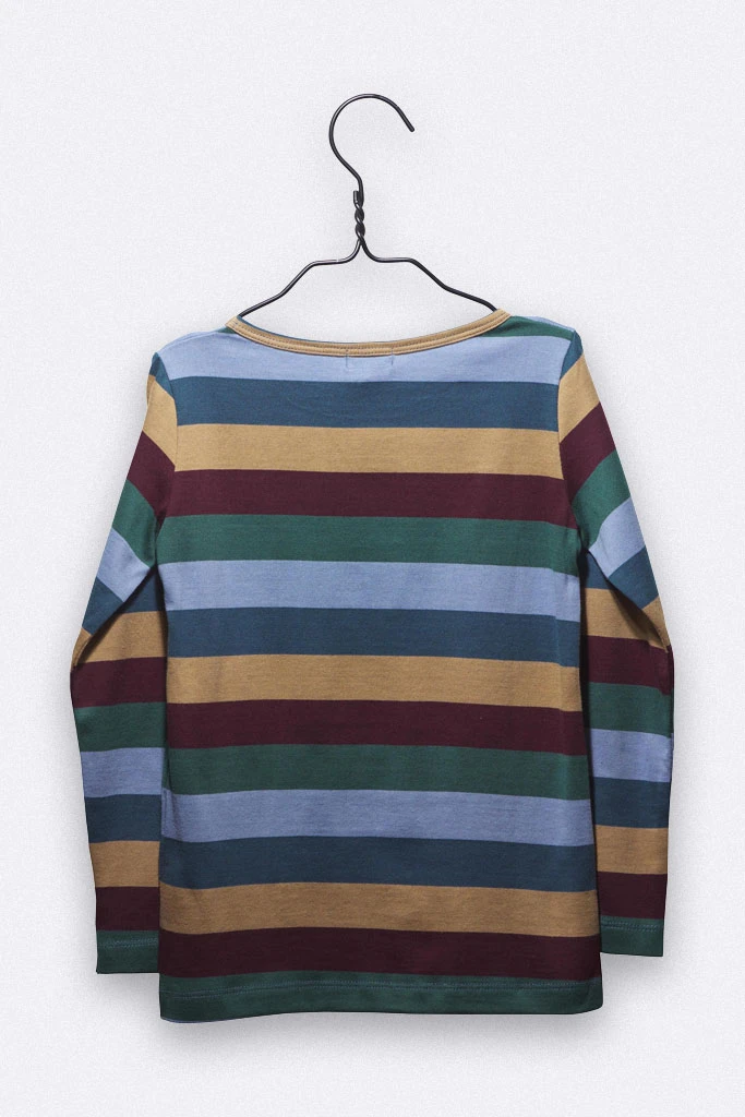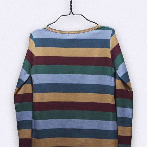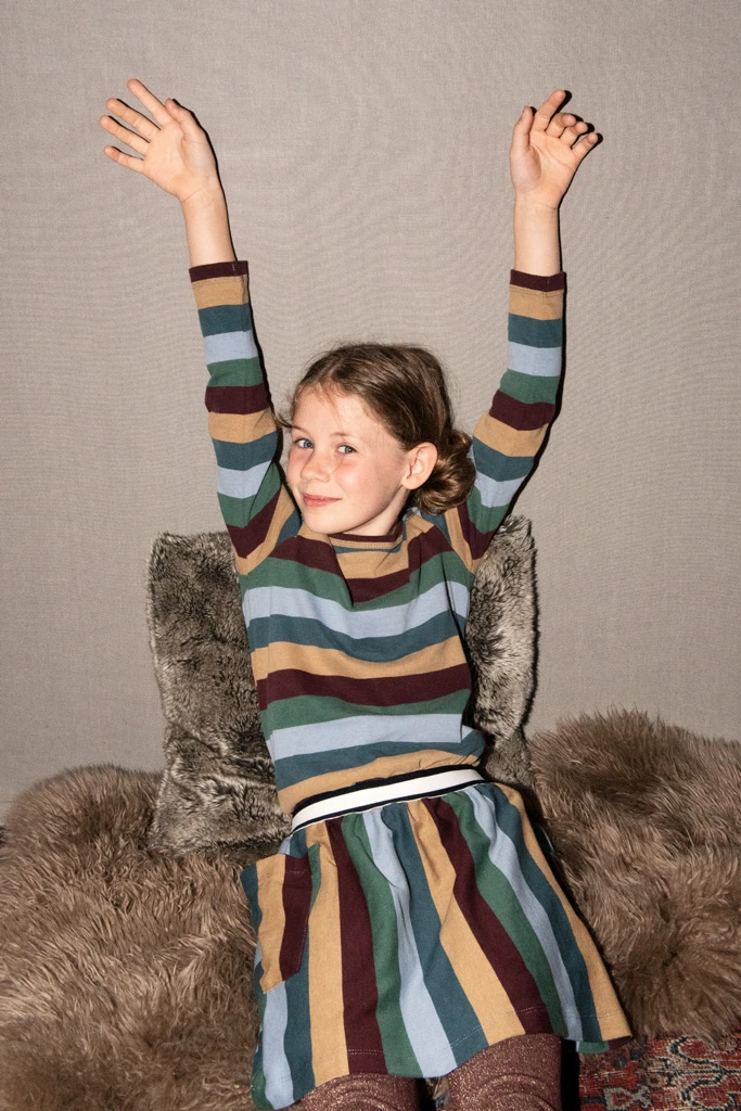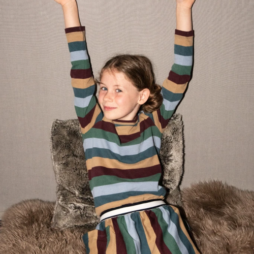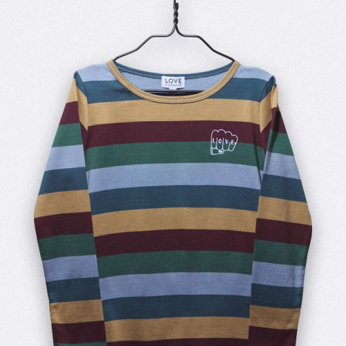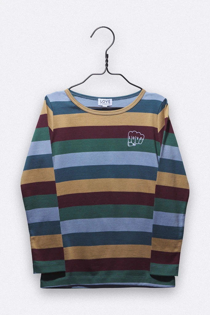 This longsleeve is anything but basic. In wide stripes in beautiful autumn colours it goes well with all outfits. The white LOVE fist embroidery ads a little twist and makes it the perfect find for girls, boys and women.