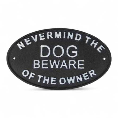 Warn with a wink thanks to our Cast Iron Plaque: Nevermind Dog, Beware Of The Owner. Playfully subverting the usual cautionary sign, it highlights that some threats come unexpected forms. Made from heavy cast iron, this plaque holds up under outdoor conditions while providing tongue-in-cheek humor. Mount it on gates, fences, or doors for a sly reminder that keeps unwanted visitors on their toes and entertained.