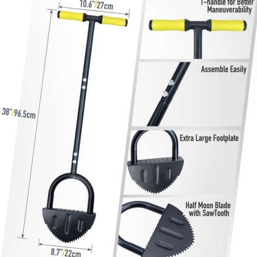 IDEAL FOR EDGING WALKWAY AND GARDEN — easy to use and make your yard lines Neat, Trim, and Tidy. Create deep, clean borders along sidewalks, driveways, patios, gardens, and grass lawns. Also useful for installing plastic edging. This manual edger lawn tool is planet-friendly and low-maintenance.ARCHED BLADE WITH SAW TOOTH — steel blade with saw-tooth slices through dense turf easily & cleanly. Powder coated durable steel construction of lawn edger ensure durable & long lasting use.LARGE FOOT PLATFORM — step edger with an extra-wide Foot Platform makes it easy to maximize force with your body weight, brings optimal digging safety and performance.SAVES YOUR BACK & KNEES — 39″ edger lawn tool with long handle, lets you edging without having to bend over or go down to your knees. T-handle with soft cushion for comfort & better maneuverability.