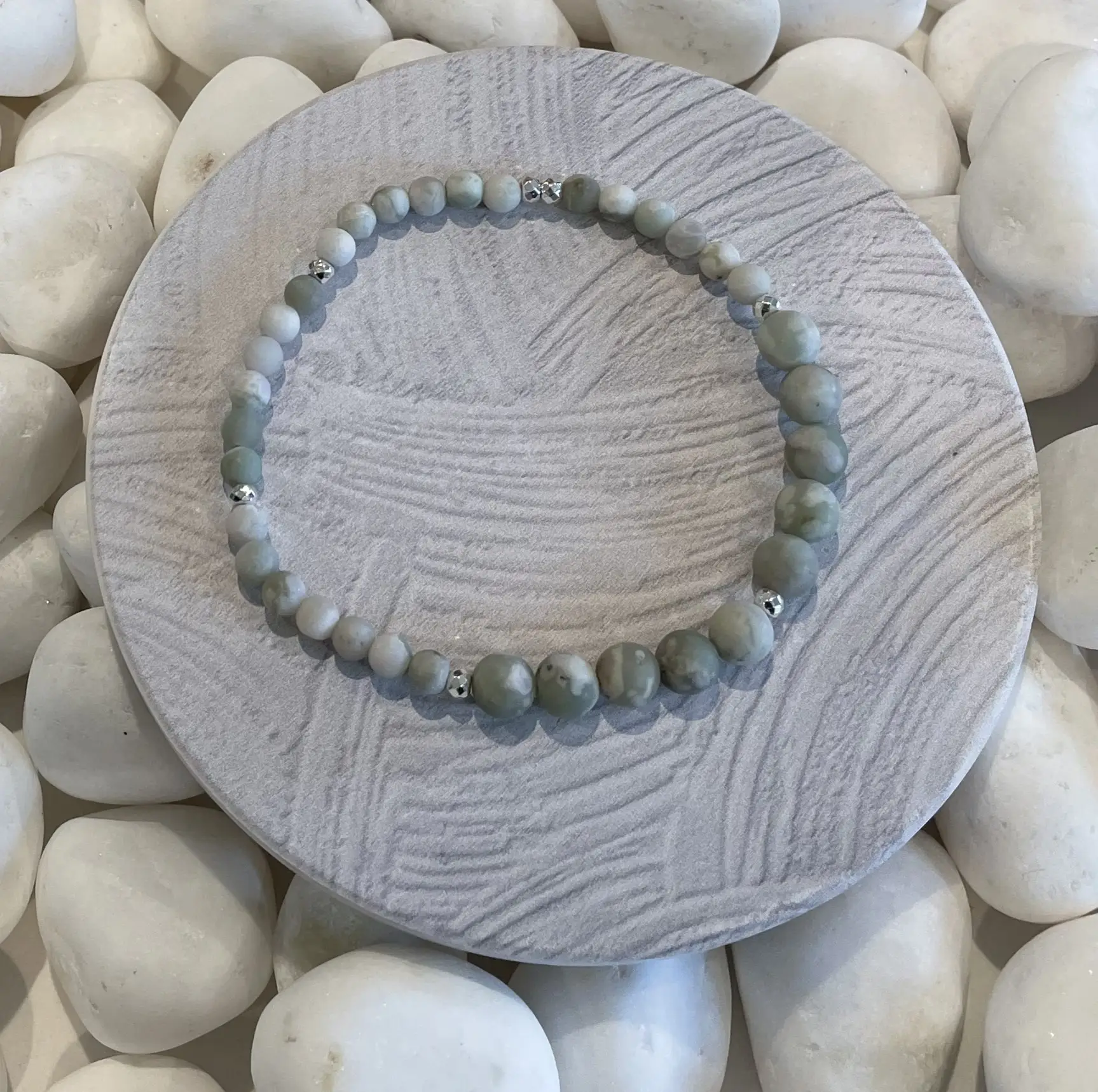 FALL in love with our new Top Drawer Gemstone Collection of high-end semi–precious gemstone beads. Harmony Jasper matte in 4.5mm and 6.5mm Spacer beads are silver electroplated micro-faceted hematite Harmony Jasper is sometimes referred to as Peace Jade. 8″ Proudly Made in the USA