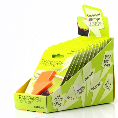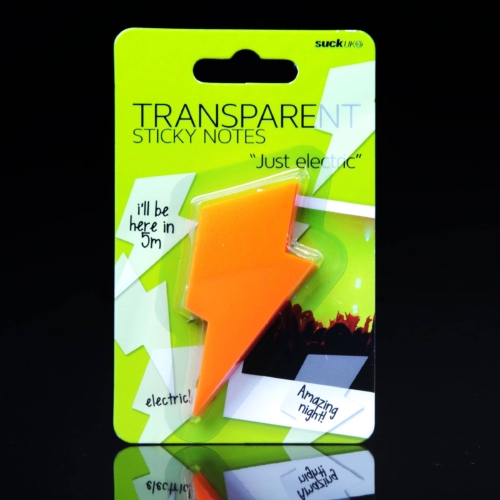 Extra special sticky notes made from translucent paper, to give a semi-clear, semi-opaque effect. Lightning bolts can be used to make a statement. Use these sticky notes to annotate magazines, photos and everyday objects.The glue won’t leave a mark and the smooth surface is perfect for pencil or pen. The transparent sticky notes are the perfect gift for any stationery lover.Fun and unique alternative to every day sticky notes!100 sheets per packet.