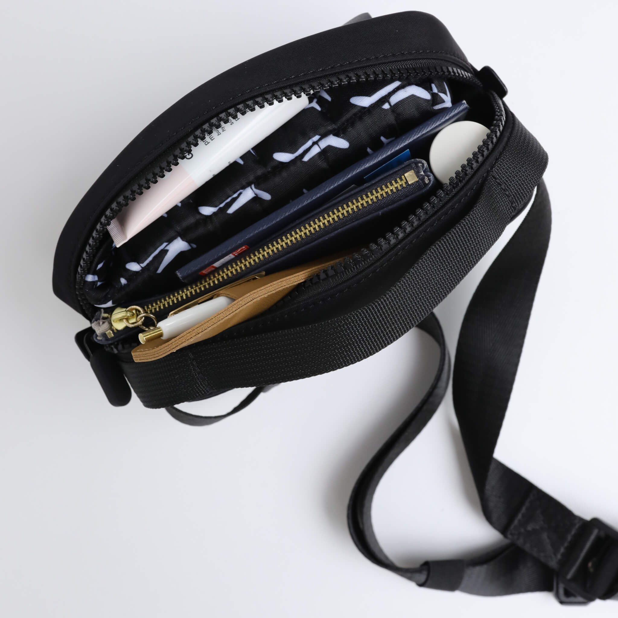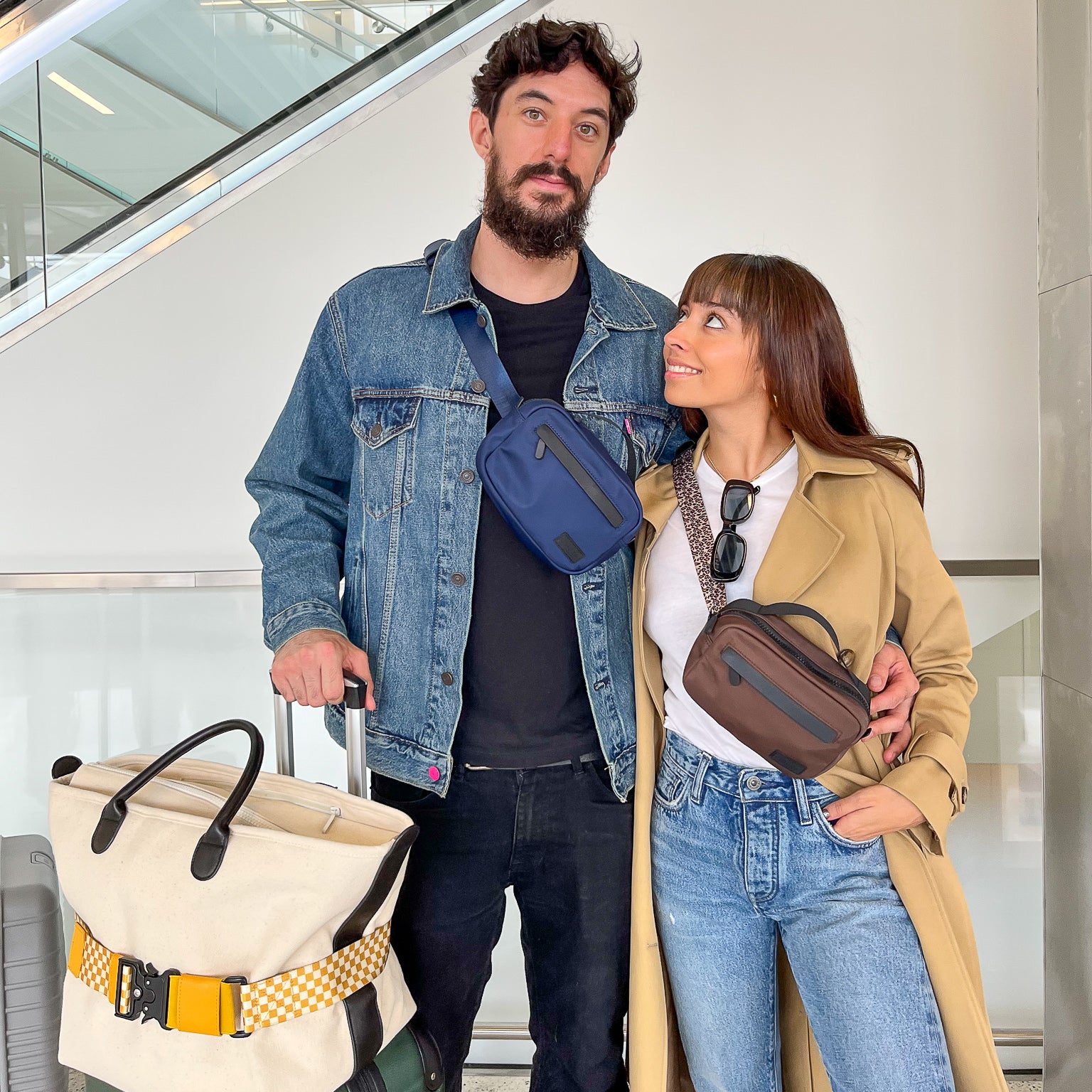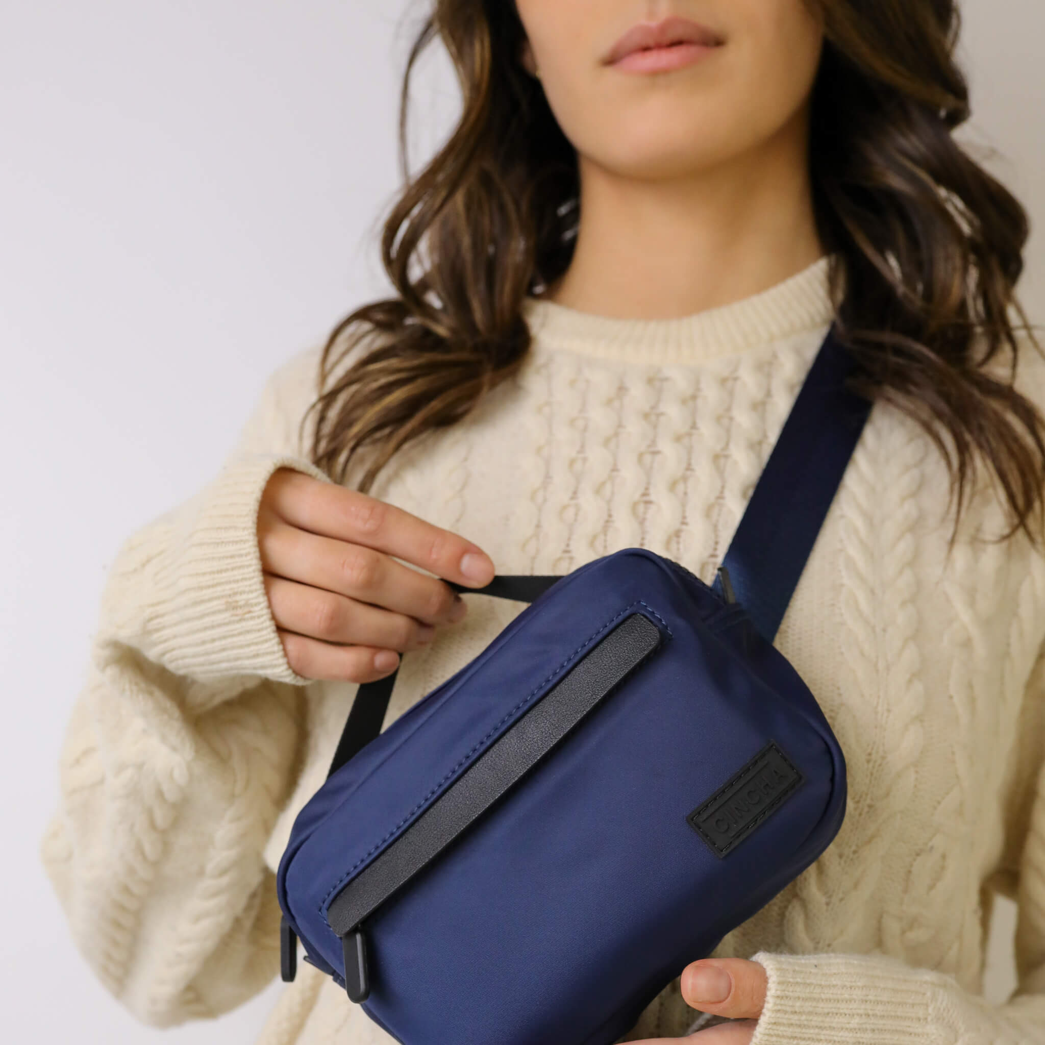 Note: The straps are permanently attached to the bag. 2-in-1 Sling and Travel Belt functionality Secure zip closure Made from upcycled and water-resistant nylon Adjustable sling strap Strap length when fully extended: 125 cm (49″) Top handle for comfortable holding 2 interior (small) pockets for more organization External back pocket for boarding pass Secret Slip passthrough to go over trolley handles Available in 4 classic colorways Dimensions – 7.5 x 5.25 x 2.25 in