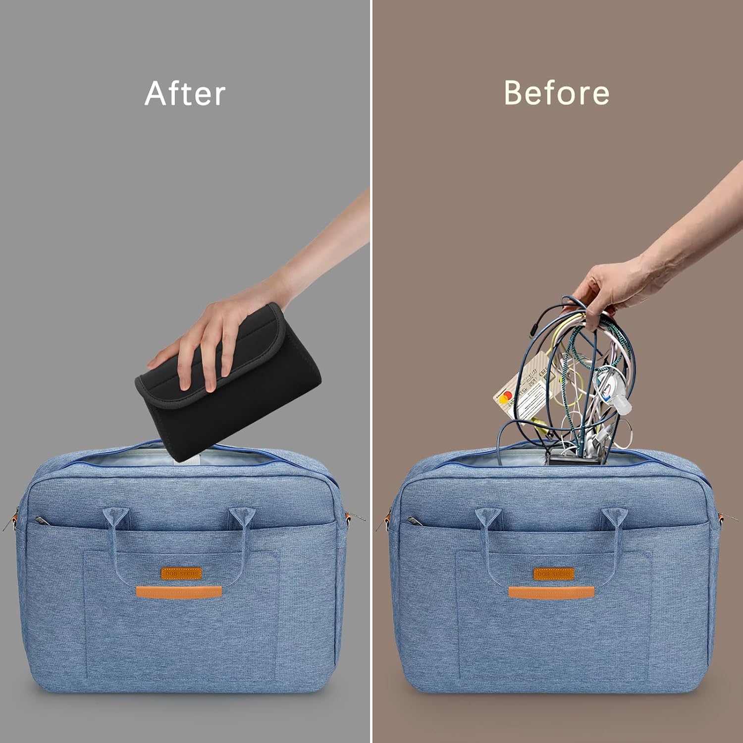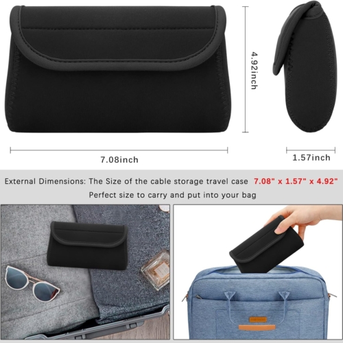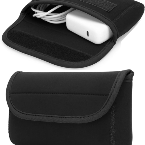 Size about 7.68″x 3.93″x 1.58″, Weighing only 1.38 oz, slip this slim pouch into backpack, handbag, tote bag, or laptop sleeves.So the small travel tech pouch is easy carrying.Made of flexible yet rugged neoprene, this organizer resists scratches, spills, and daily wear. Safeguard your gadgets from bumps, dust, and light moisture during travel or commutes.The extended Velcro length enhances security, ensuring your items stay firmly in place.Used to protect power adapters for MacBook Air / Pro / iPad Pro and other similar size power adapters for phones, tablets, notebooks. Perfect for small adapters (not for oversized models).Multifunction: this lightweight neoprene pouch stores wireless mouse, power banks, cables, External Hard Drive and phones, etc. You can even use it as a cosmetic bag.