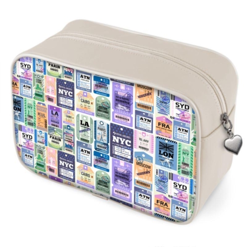 Travel destinations themed designer wash bag by Sorbèy. Sorbèy is a producer of a large range of original products. Clothing for the body. Accessories for the home. Artwork for the soul. Patent Vinyl. 100% poly – satin print area. Piping trim detail. 24 x 16.5 cm x 10 cm. Waterproof lining. Handmade to order.