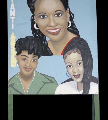 Beauty salon signs, as well as barbershop signs are common throughout Africa. Although they may exist everywhere they have reached their highest point of artistic expression in Togo, in my opinion. This sign is hinged at the top and so has another side which is also available on this site, item #631A. Each side is the same price, $250 each. If both are purchased together, the complete sandwich sign, attached at the top with the original hinge, the price is $400. This sign measures 35 x 24″ (89 x 61 cm), 50 1/4″ tall with legs (128 cm). We can remove the legs if you have no use for them. In addition to enhancing their utility for you, removal of the legs will also reduce the cost of shipping them to you.