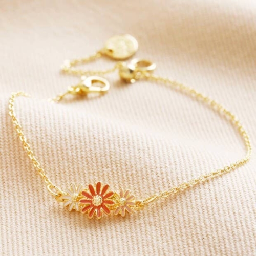 Made of 14ct gold plated brass, this sweet bracelet consists of a delicate trace chain attached to either end of a row of layered flowers. The flowers each feature a detailed hammered centre and delicate petals and are infilled with colourful glossy enamel, with one peach, one pink, and one white flower. The bracelet fastens via a lobster clasp and can be adjusted to any size using the ball slider. Why not layer it up with your other favourite bracelets for a stylish everyday look?Dimensionsinner circumference – can be worn up to 18.4cm (7.25″)