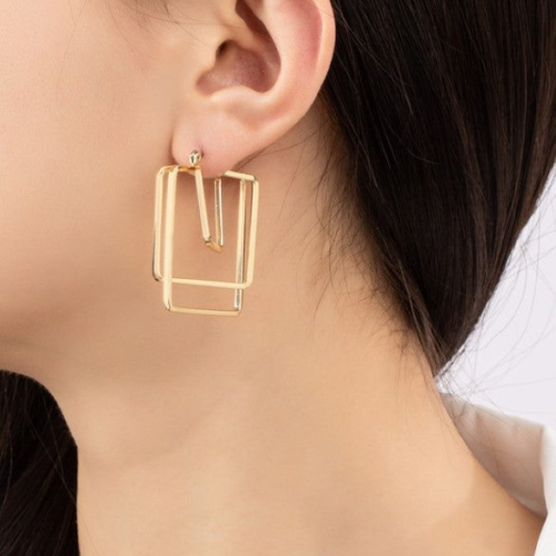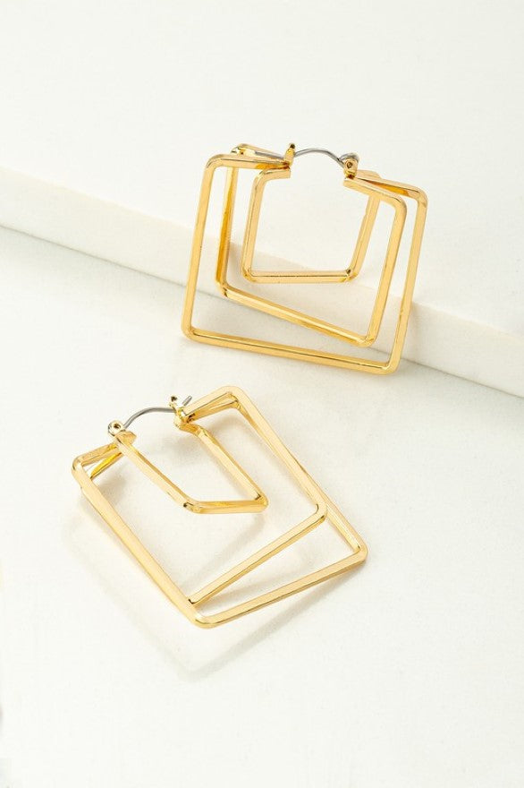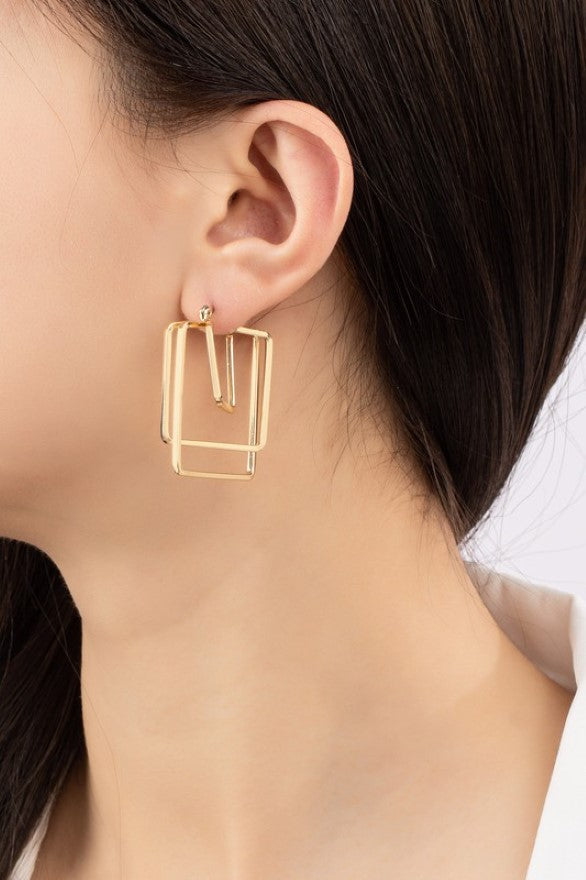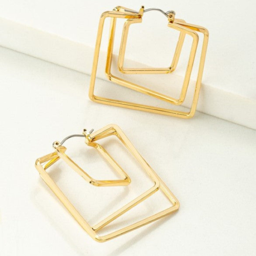 Make a bold statement with these triple square hoop earrings. Featuring three interconnected square hoops, these earrings offer a unique geometric design that’s perfect for adding a touch of modern sophistication to any outfit. product details1.25″HoopIronShiny gold plating