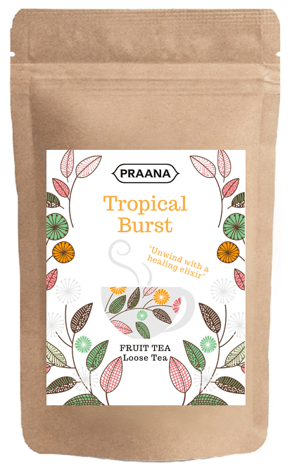 Tropical Burst is one of the best variants from PRAANA TEA to be tried once; it includes apple, rosehip, pineapple pieces, coconut pieces (sulphites), and Hibiscus petals to reap all the essential vitamins without any caffeine.