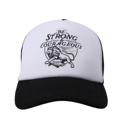 Designed with a poly-foam front panel in a crisp shade of white, and a black acrylic mesh back, this cap strikes the ideal balance between a classic aesthetic and modern flair. The centerpiece of this cap is carefully printed in black against the crips white paneling, and proudly displays Be Strong Courageous with striking imagery of a lion, lending a touch of individuality and style to your look.