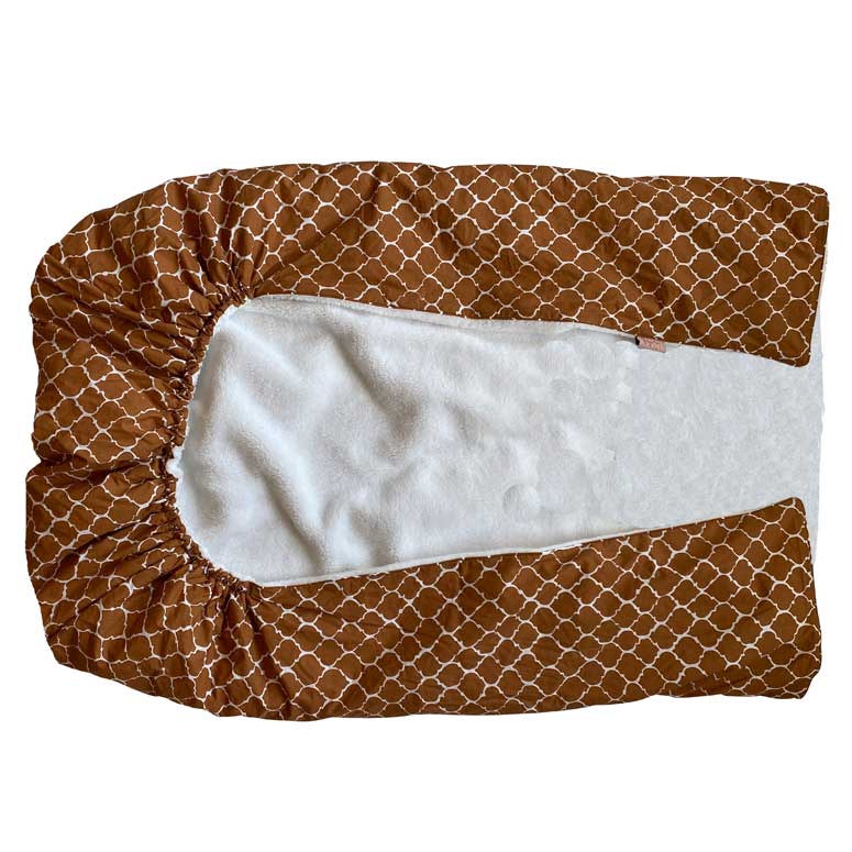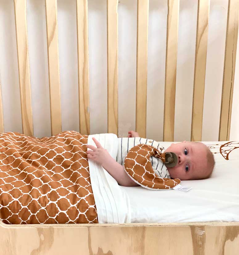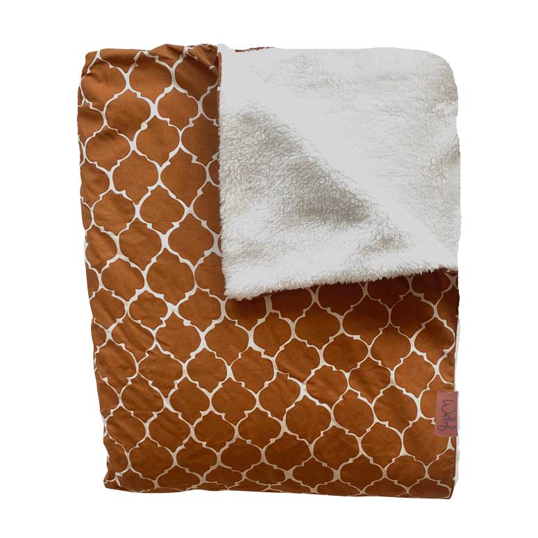 The baby blanket ‘Once upon a dream’ comes in a unique hazel brown & offwhite print. One side of the blanket is made of a supersoft offwhite teddy fabric, that even after washing remains its softness. The other side is made of poplin cotton. The blanket is reversible and finished with a piping in the same design/colour.