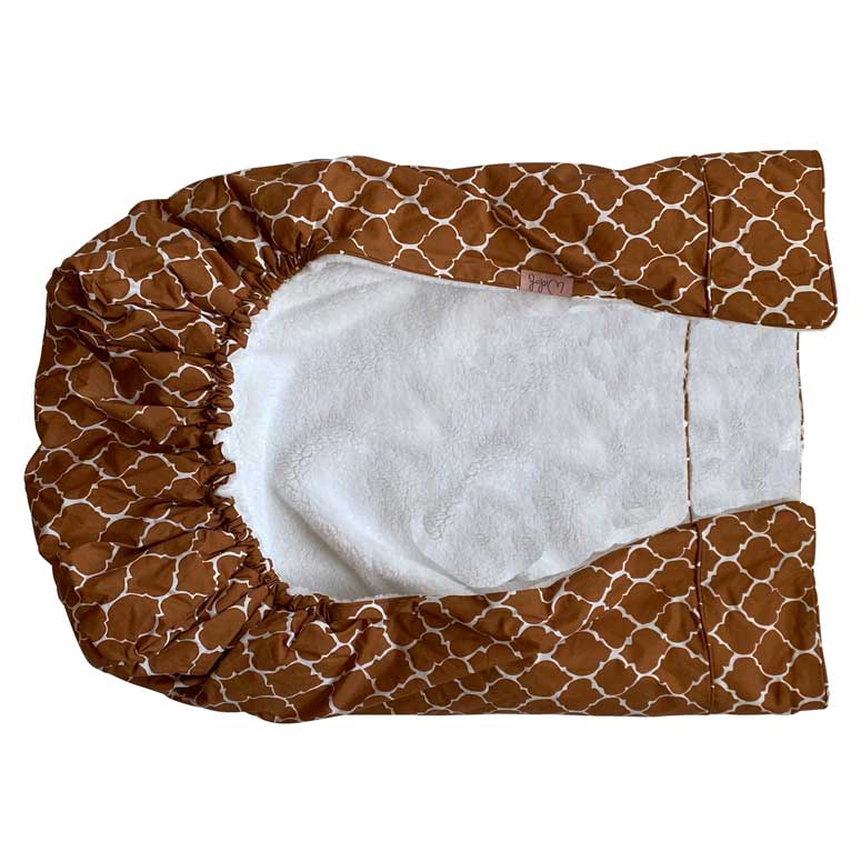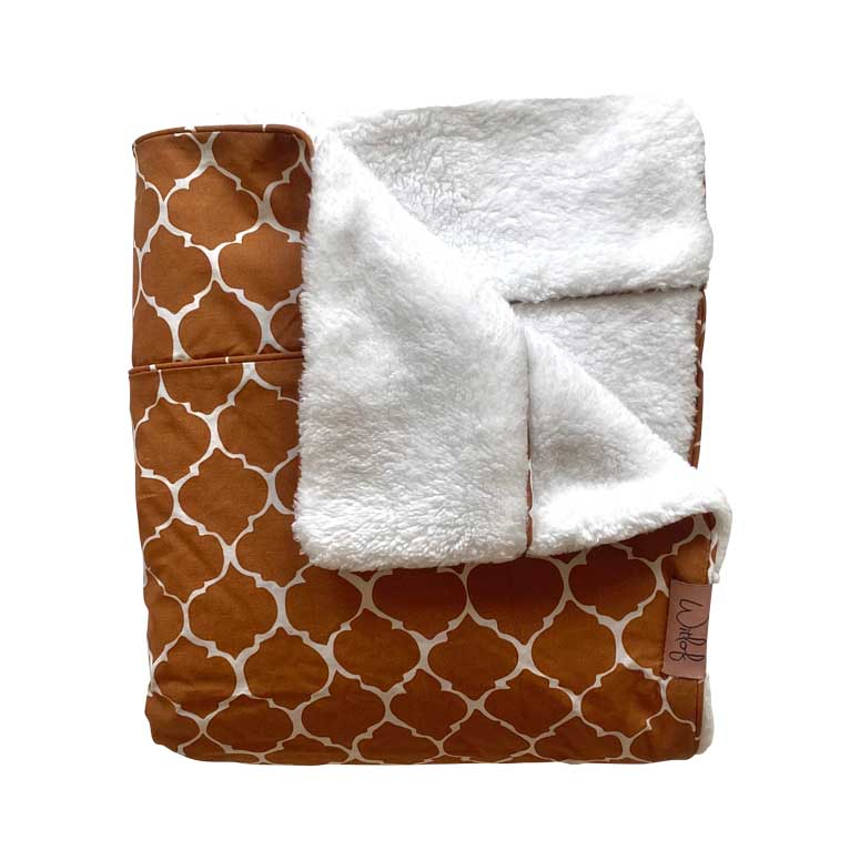 The baby blanket ‘Once upon a dream’ comes in a unique hazel brown and offwhite Moroccan print. One side of the blanket is made of a supersoft offwhite teddy fabric, that even after washing remains its softness. The other side is made of poplin cotton. The blanket is reversible and finished with a piping in the same print and colour.