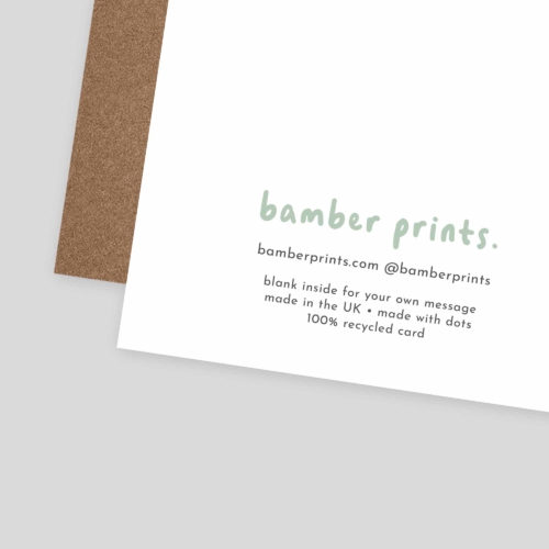 Printed in the UK on 100% recycled 350gsm card. Size A6 when folded (105 x 149mm). Accompanied by a kraft brown, recycled envelope and blank inside for your own message. Each card comes inside a biodegradable cello bag to keep it safe and reduce plastic. All packaging is recyclable and plastic free.