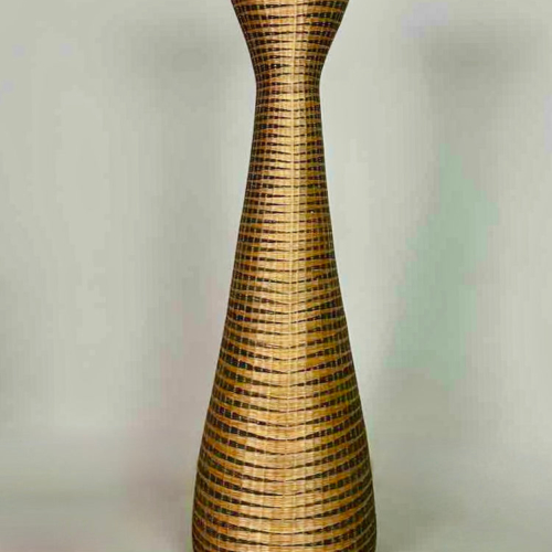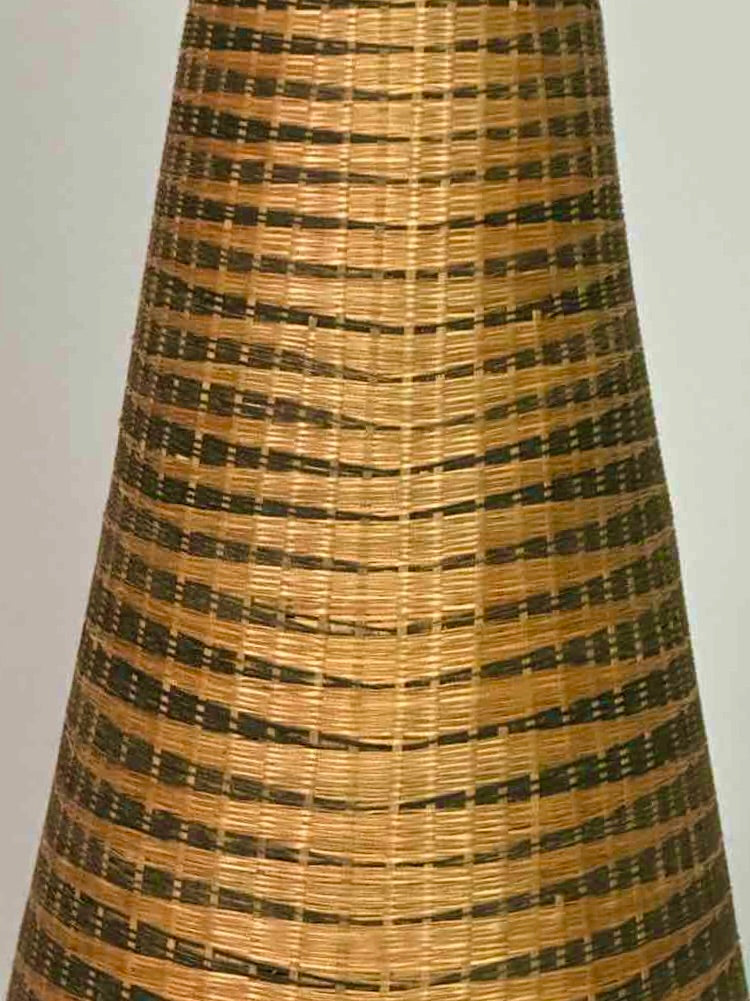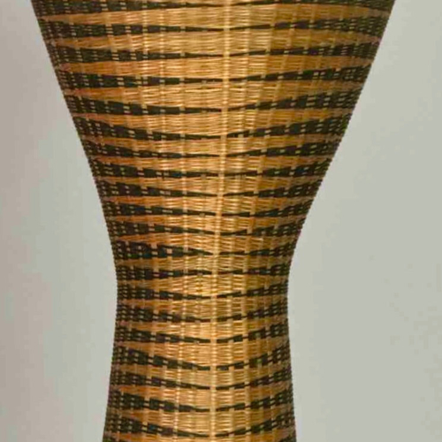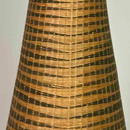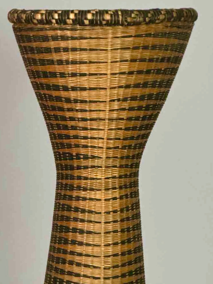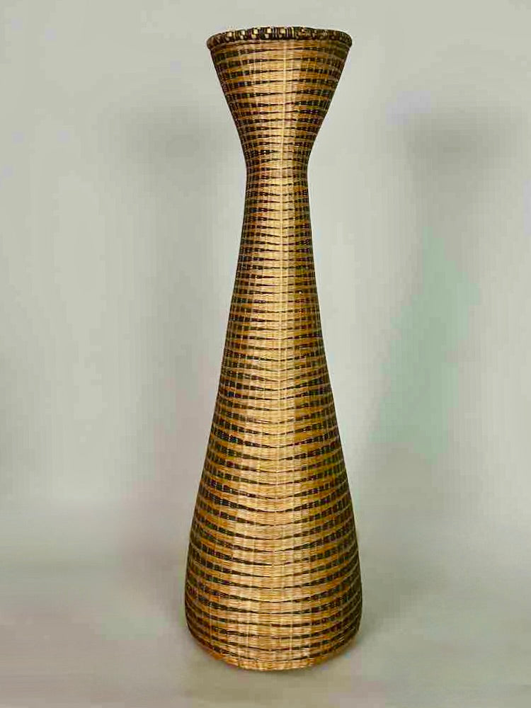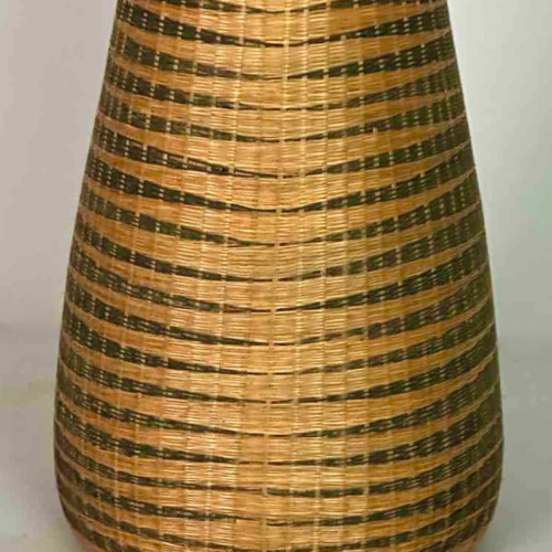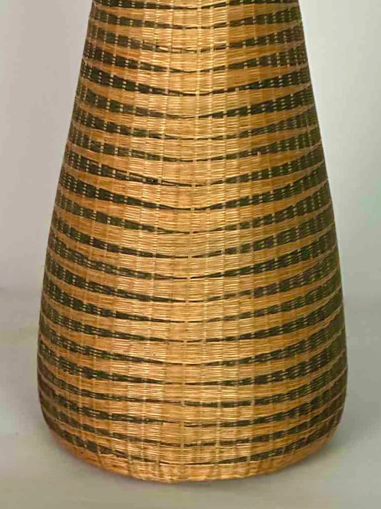 Made from from vegetable fibers by the Tutsi women. The grasses of these trees were soaked in the water for roughly two weeks until the fibers become pliable. What really sets these baskets apart from the rest is their very intricate weaving patterns, their use of very fine woven material and the extraordinarily tight weave. The range of patterns is quite diverse which shows the innovation of the highly skilled women of Rwanda who make them. This basket measures 23 1/4 x 7 1/2 ” (59 x 19 cm)