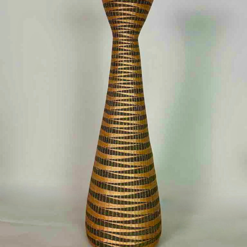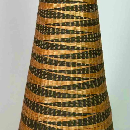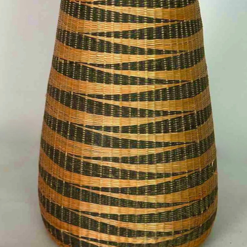 Made from from vegetable fibers by the Tutsi women. The grasses of these trees were soaked in the water for roughly two weeks until the fibers become pliable. What really sets these baskets apart from the rest is their very intricate weaving patterns, their use of very fine woven material and the extraordinarily tight weave. The range of patterns is quite diverse which shows the innovation of the highly skilled women of Rwanda who make them. This basket measures 23 1/2 x 7 1/2″ (60 x 19 cm)