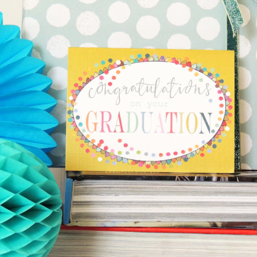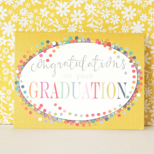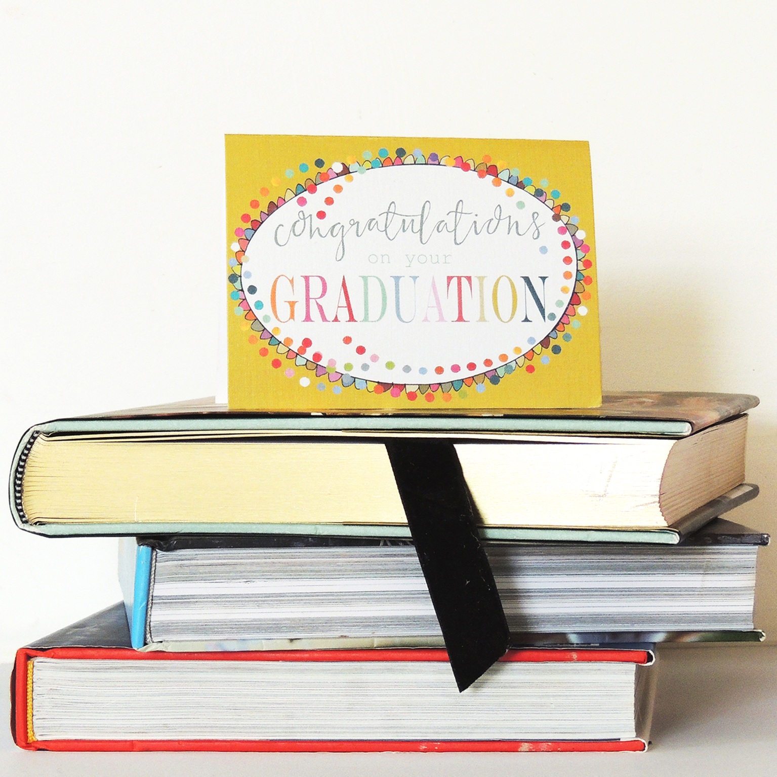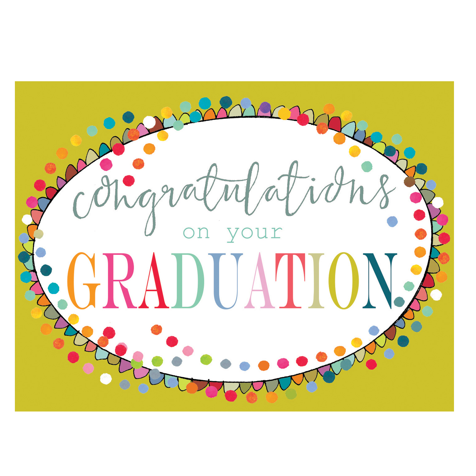 An exuberant card, perfect for congratulating a graduation; multi-coloured lettering and details on a lichen green background.