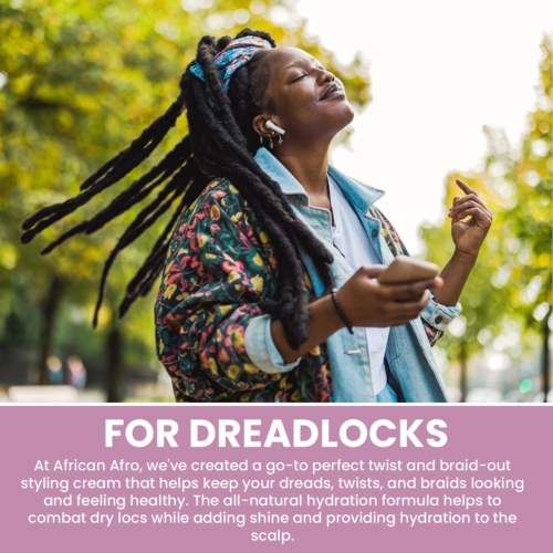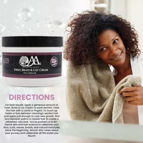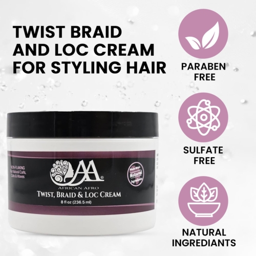 Africa Afro Shea Butter for Natural Hair Moisturizing Twist, Braid & Loc Cream is your new go-to for creating perfect twist and braid-outs. The unique creamy texture adds medium hold to braids, twists, and loc’s to increase definition and reduce frizz after fluffing or styling. With Infusions of sweet almond oil, avocado oil, shea butter, aloe vera and vitamin E. keep hair hydrated to produce a natural shine. 8 fl. oz. | Made with natural ingredients Award- winning Shea Butter formula with moisturizing creamy texture Perfect for styling curls, twists & braid-outs A daily dose of hydration while minimizing dandruff and damage. The unique creamy texture adds medium hold to braids, twists, and loc’s