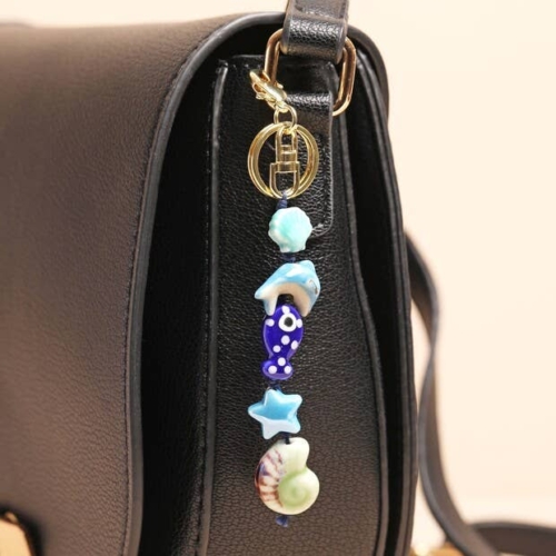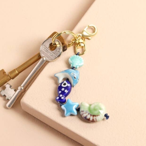 With five unique charms in different shapes and shades of blue, this accessory holds a clamshell, a dolphin, a navy blue fish, an iridescent blue star and a nautilus shell.Each ceramic charm is attached via a length of blue cord which is finished with a golden keyring and a matching clip so they can choose to attach this charm to their keys or their bag!Dimensionswidth 2cm x length 12cmMade fromceramic, cord, metal