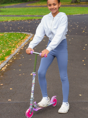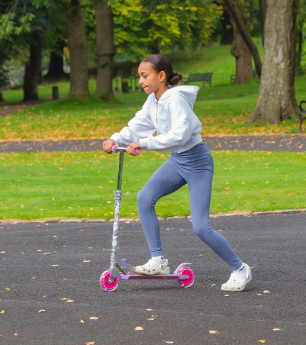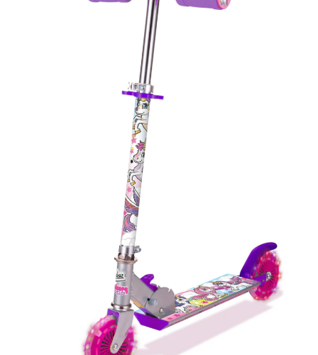 Two-wheeled scooter with a light up wheels and a unicorn design. Start moving on the scooter and the lights in the wheels automatically trigger, illuminating the front and back of the scooter. There is also a foot brake located on the back wheel, for extra control. And finally, the scooter folds flat for easy storage and transportation.