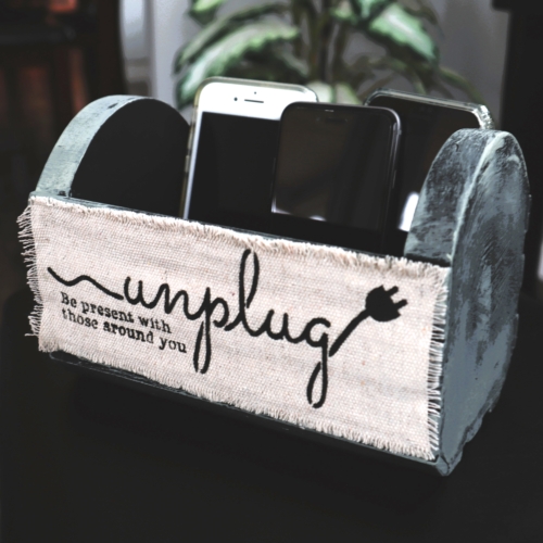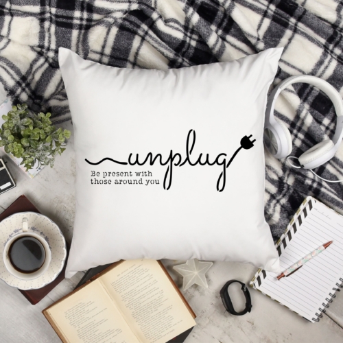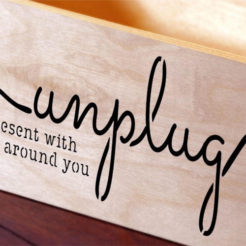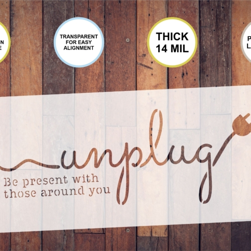 This is a reusable stencil that says “Unplug Be Present With Those Around You”.
