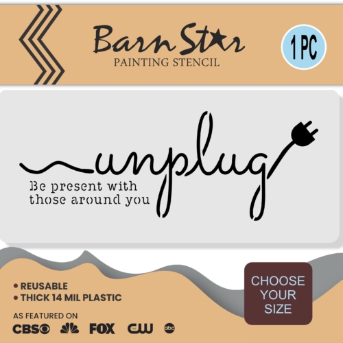 This is a reusable stencil that says “Unplug Be Present With Those Around You”.