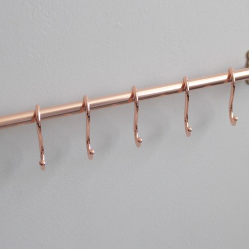 Made in North East England, this rail is designed to hang your kitchen utensils and cups in style. The brass wall mounts secure the polished copper bar to the wall, and the utensils hang on strong copper hooks. (Brass screws included)