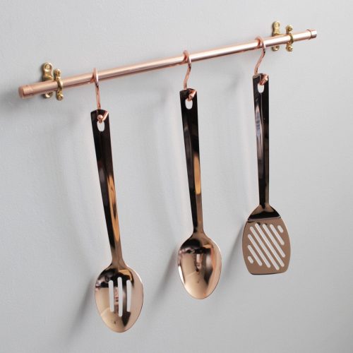 Made in North East England, this rail is designed to hang your kitchen utensils and cups in style. The brass wall mounts secure the polished copper bar to the wall, and the utensils hang on strong copper hooks. (Brass screws included)