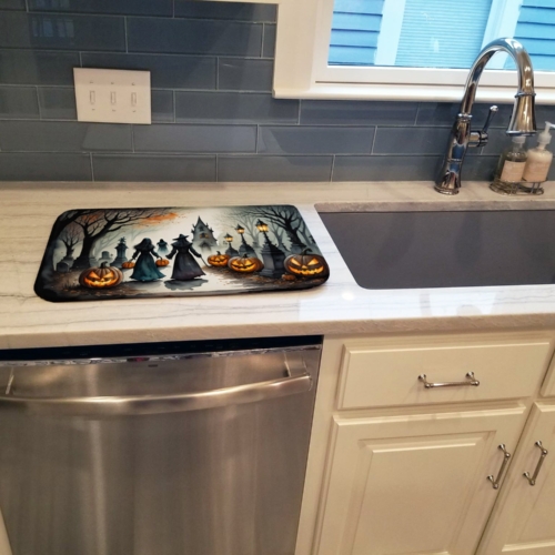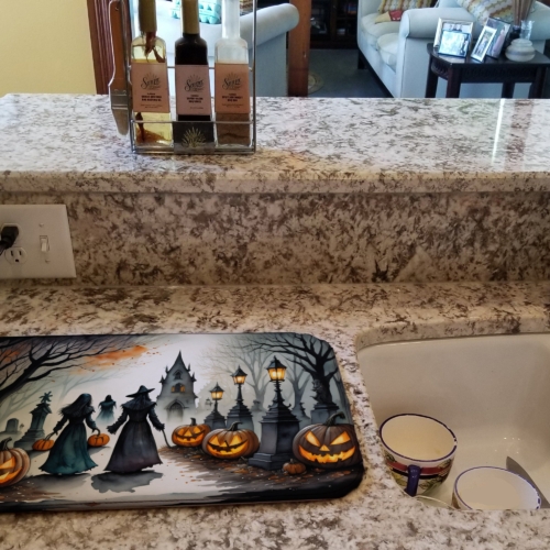 Celebrate Halloween with this Halloween Dish Drying Mat. Say goodbye to messy countertops and soggy dish towels with our innovative dish drying mat. Our high-quality dish drying pad is designed to keep your countertops dry while offering a stylish and efficient solution. Whether you’re air drying dishes, glasses, stemware, silverware, pots, pans, bottles, or even fruits and vegetables, our dish mat is the perfect choice. The 14 inches x 22 inches size fits most counters and dish drying racks, and the non-slip design ensures stability. Made with water-absorbent polyester and a polyurethane foam insert, our dish drying mat is not only functional but also durable. It’s machine washable and printed in the USA for long-lasting use. The beautiful artwork adds flair to your kitchen decor, making it a perfect housewarming gift or present for any occasion. Upgrade your kitchen experience with our absorbent and versatile dish drying mat.