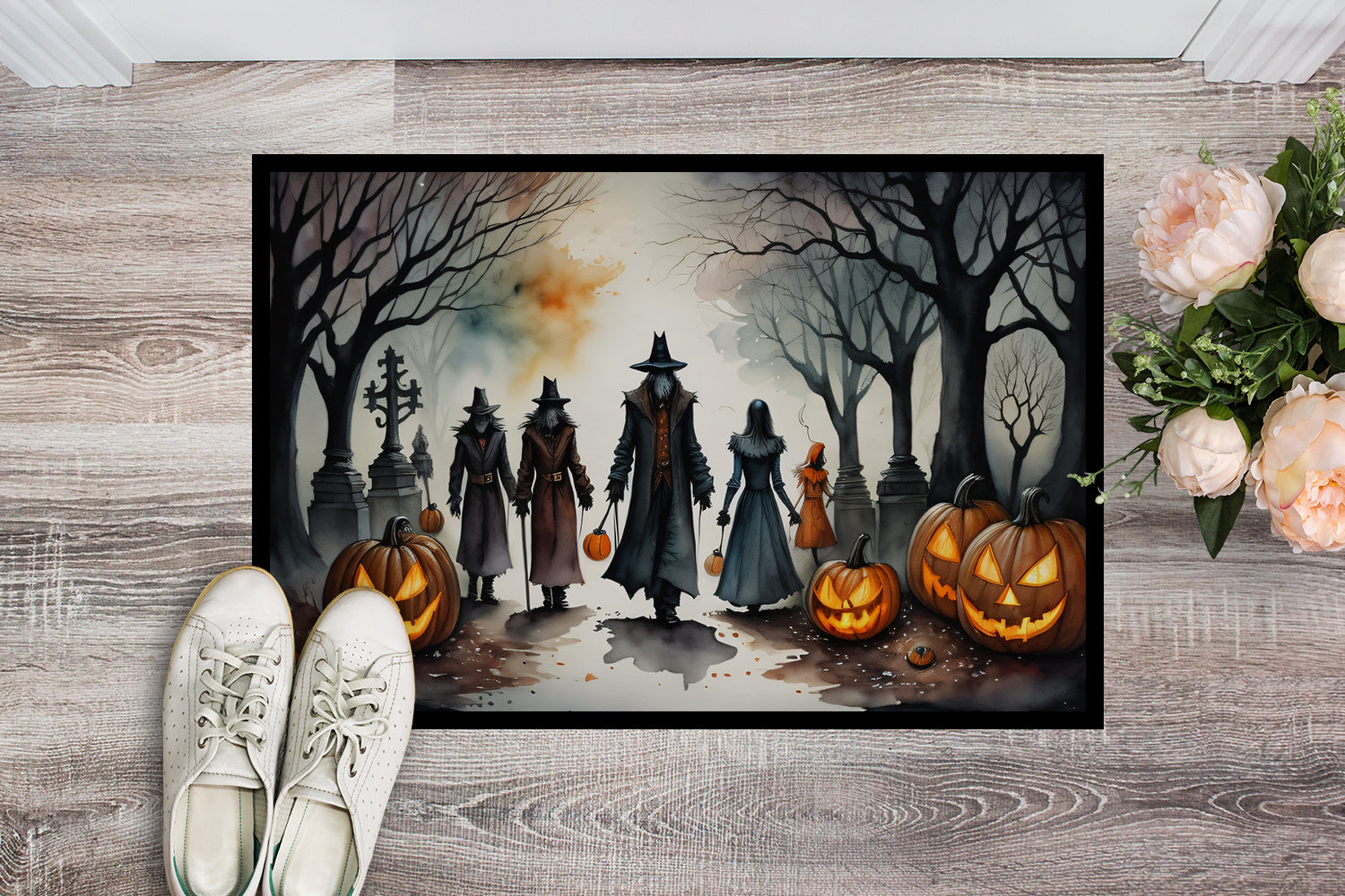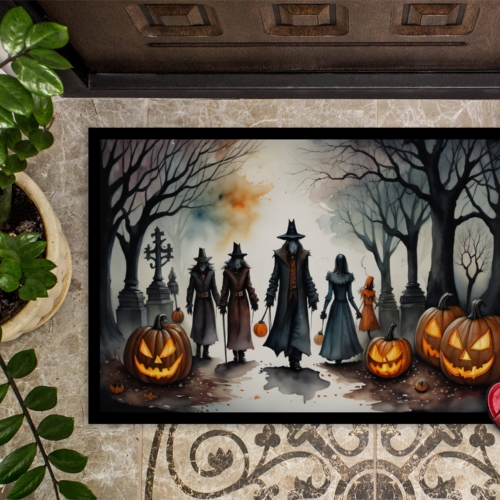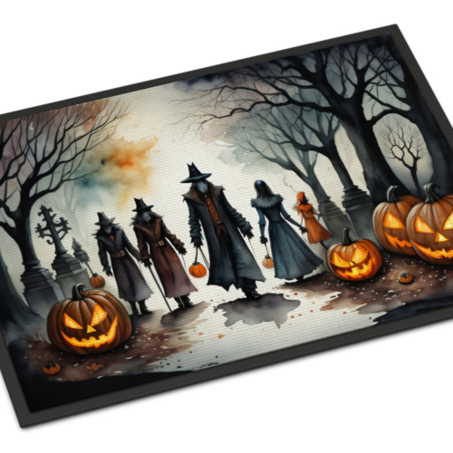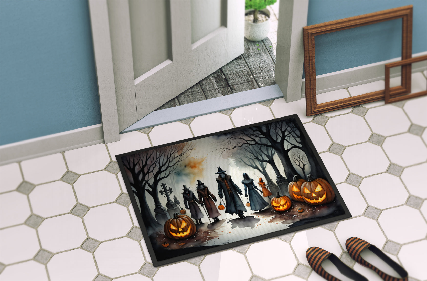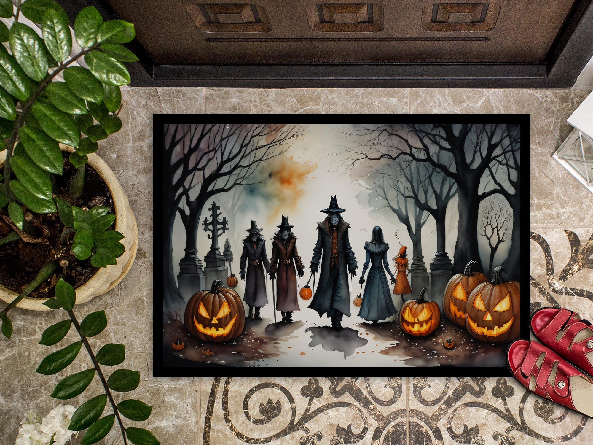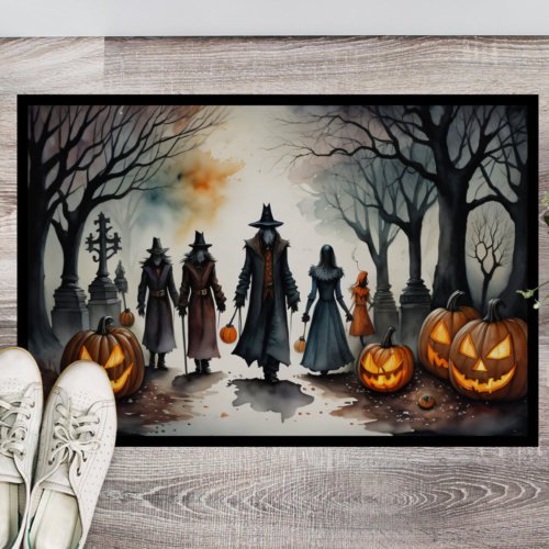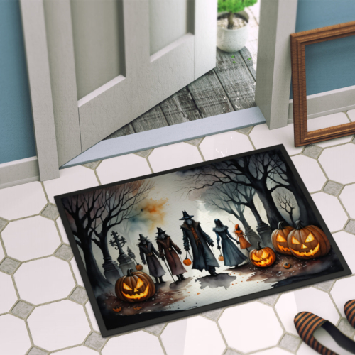Celebrate Halloween with this Halloween Doormat. Welcome your guests in style with our Artwork Door Mat, designed to withstand almost any weather condition. This mat, measuring approximately 24 by 36 inches, is held together by durable black binding tape. Its top layer, composed of polyester felt, is dyed with the eye-catching image you see on the mat. A few layers below provide the mat with stability, while its rubber bottom is stamped to help prevent slipping and ensures safety. Our mat works wonderfully as both an indoor or outdoor door mat. For cleaning, simply hose it off with water or use a power washer – no need for any cleaner that produces suds. Avoid scrubbing with a brush, instead, opt for the vacuum on floor setting. Designed manufactured and printed in the USA, this mat is a perfect addition to your porch, outdoor kitchen, entryway, or any indoor space. Its unique design makes it a charming decorative rug that greets your guests and adds a stylish touch to your home decor.