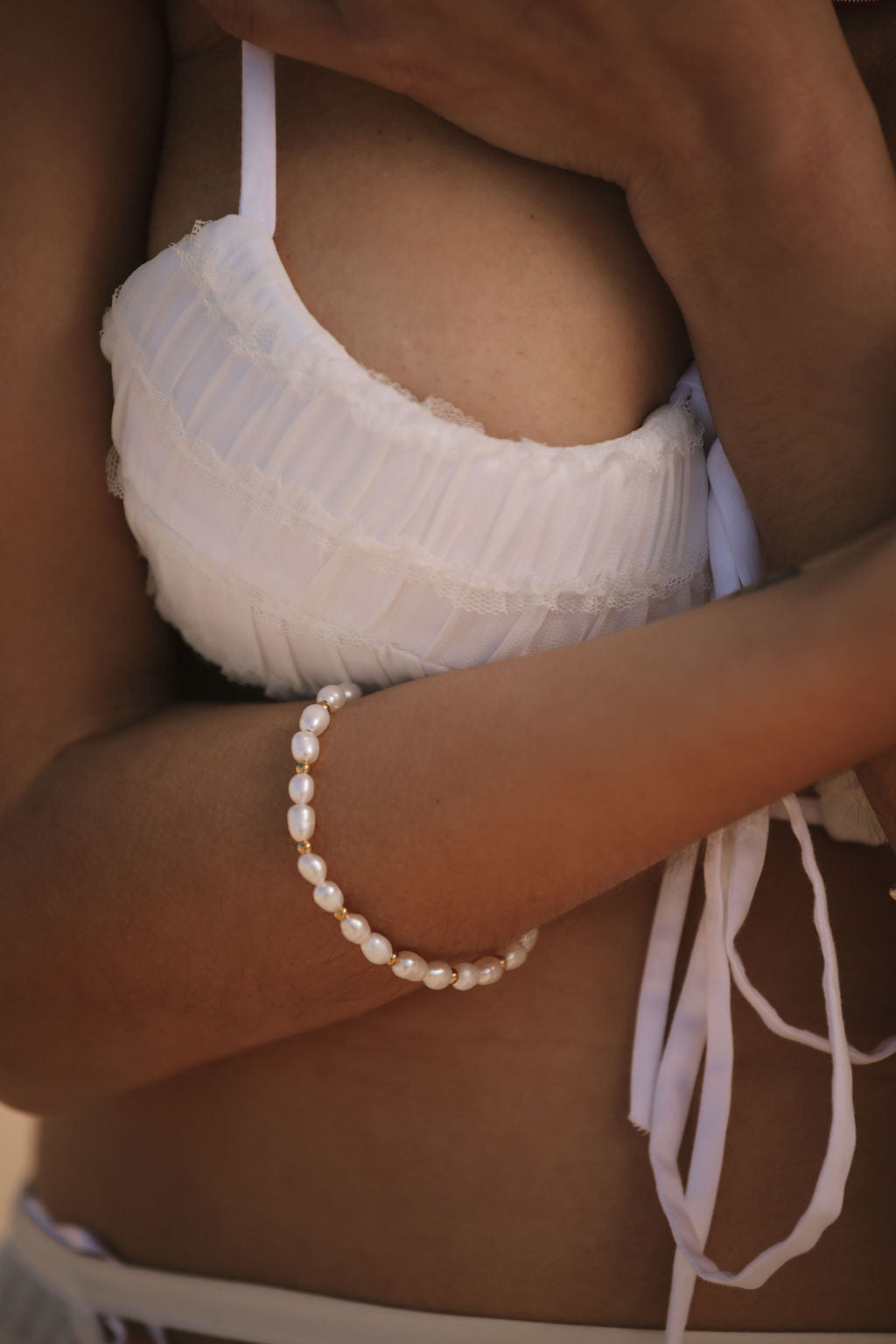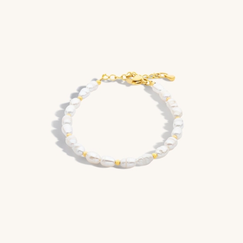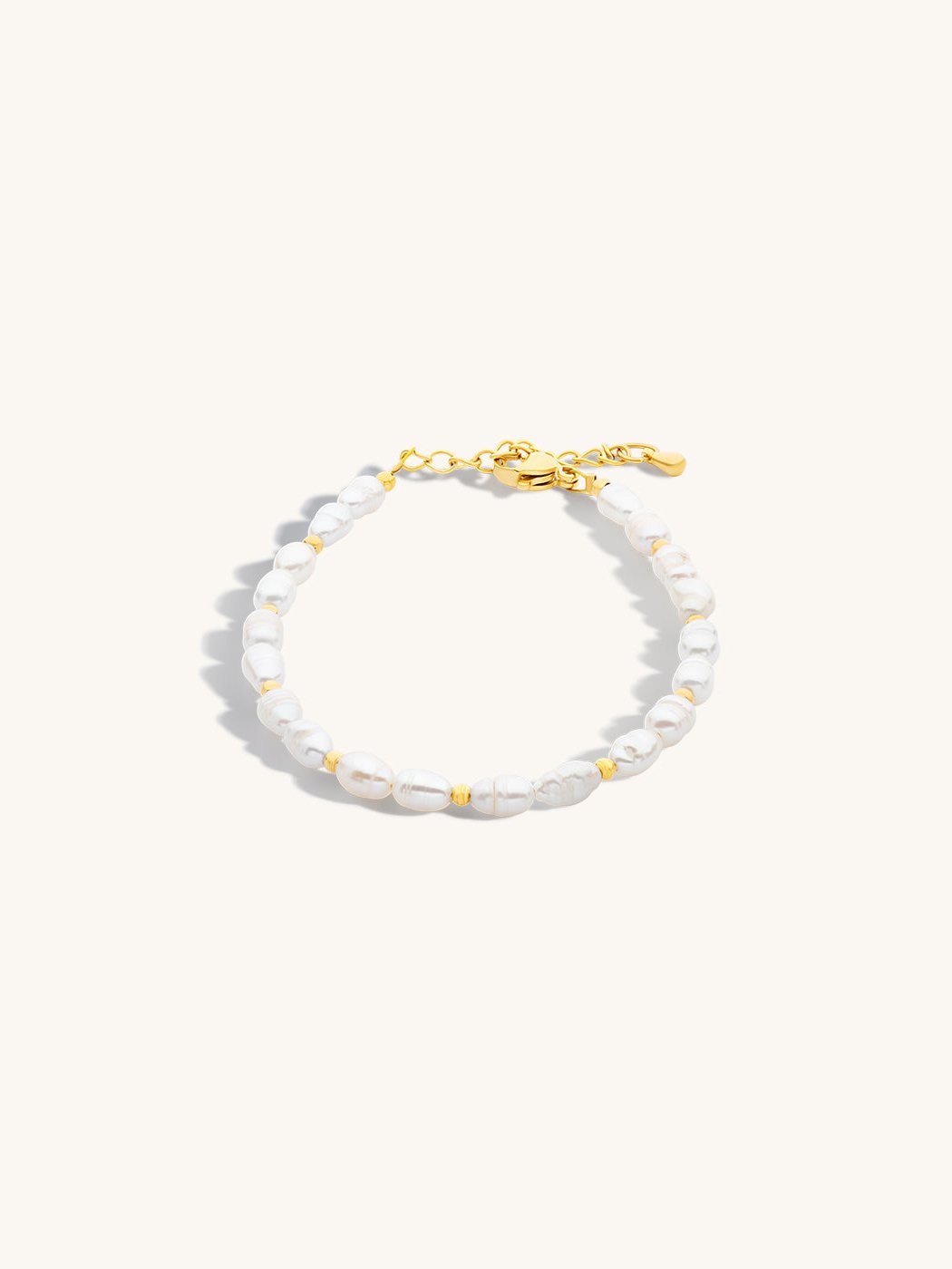A string of freshwater organically shaped pearls offset with small gold beads make this bracelet a must-have for the season. Pearls are known for bringing wisdom and knowledge, making this the ultimate way to add texture to your wrist stack. MATERIALS : 18k gold plated silver, pearls SIZING : 6″ length + 1″ extender MEANING : Freshwater Pearl – purity, balance and inner wisdom