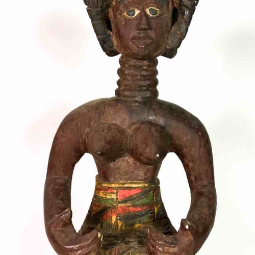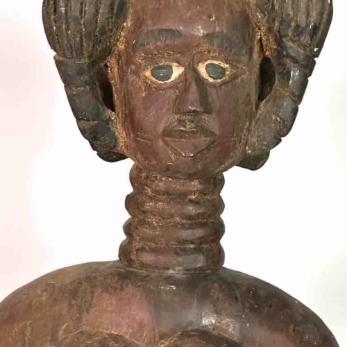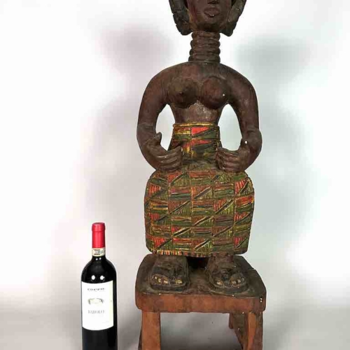 One of the strongest faiths of the African people is reincarnation. The word reincarnate also implies a constant cycle of life. Therefore infertility is considered a detrimental curse, as it stops the cycle of rebirth. To ensure healthy pregnancy, birth, and life, the Ashanti people employ spiritual aids of mothers and children. The Ashanti – aka Asante – the largest tribe in the Akan group inhabiting a large area of Ghana and Ivory Coast, believe the greatest role of a woman is to become pregnant, give birth and raise the children. Thus this figure is made to ensure the prosperity of the cycle of life. This statue measures:10 1/2 x 10 x 33 1/2″ (27 x 25 x 85 cm)